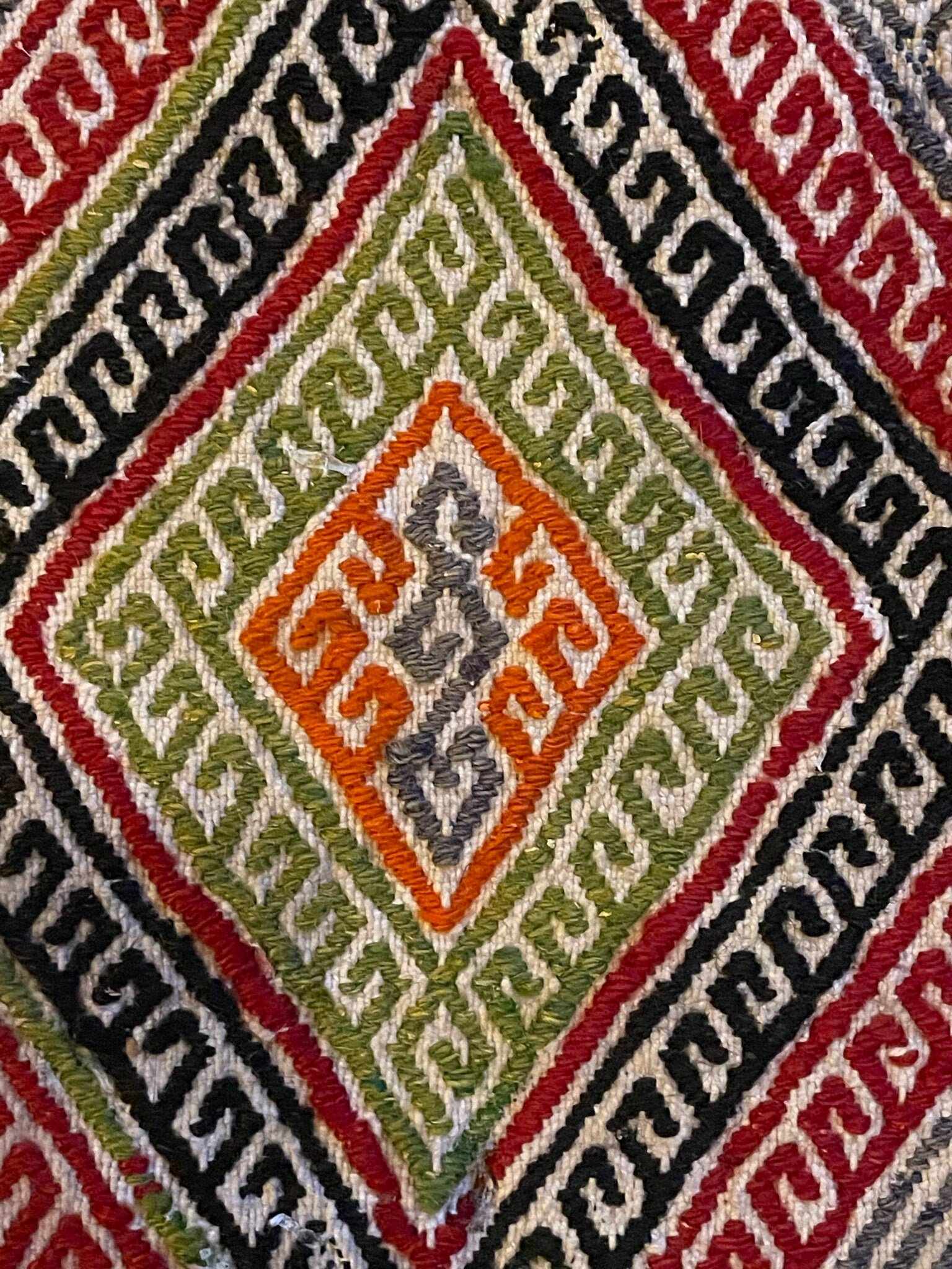 Stunning geometric patterned antique wool rug. Also gorgeous as a wall hanging, this piece is clearly hand-knotted, as you can tell by the threads on the reverse side.