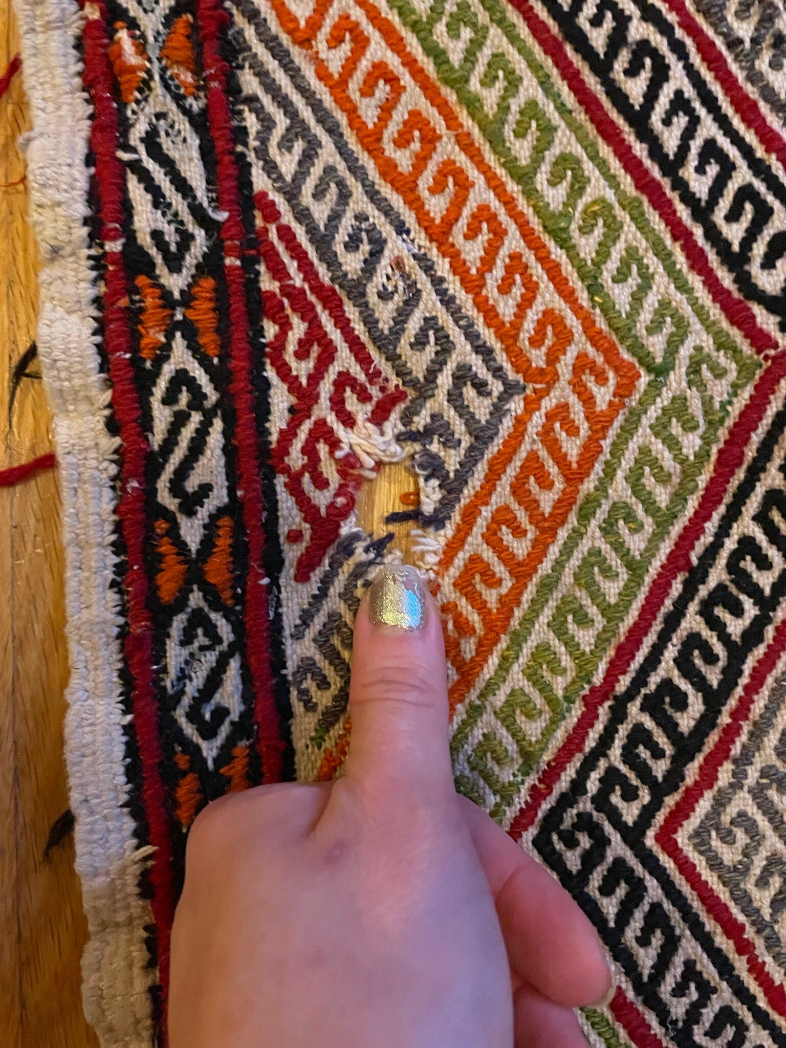This beauty is about 100 years old, and is in a condition reflective of that. Pictures of the worn areas are in the listing. There is one small hole about the size of a fingernail - it's hard to see unless pointed out. The colors are a bit faded in some places, which can be revived a bit with some cleaning. Unlike other vintage rugs, this one has no smell or signs of imminent wear.