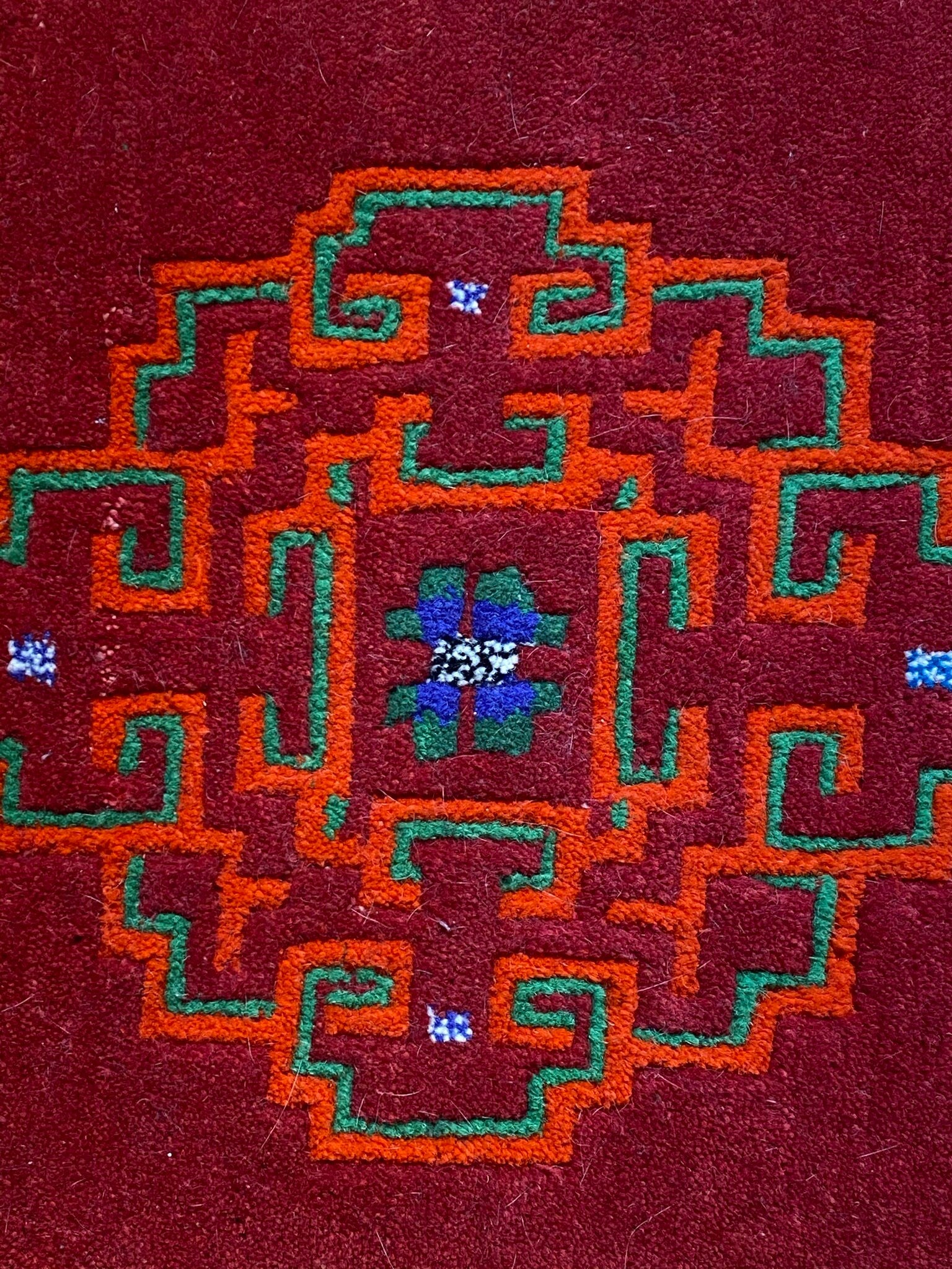 Vibrant hand-knotted Tibetan wool mat is red, orange, green, black and red with a very calming pattern.