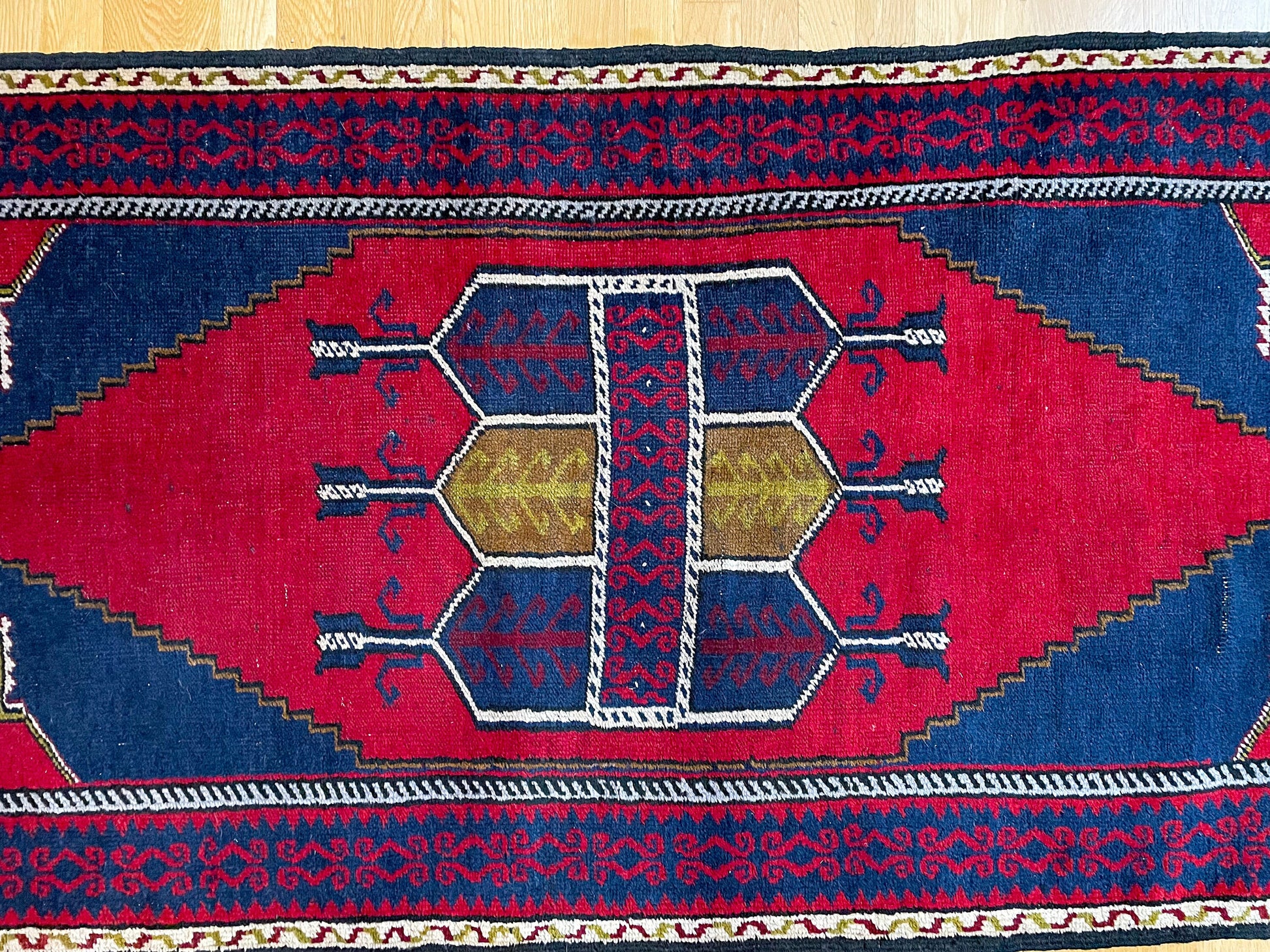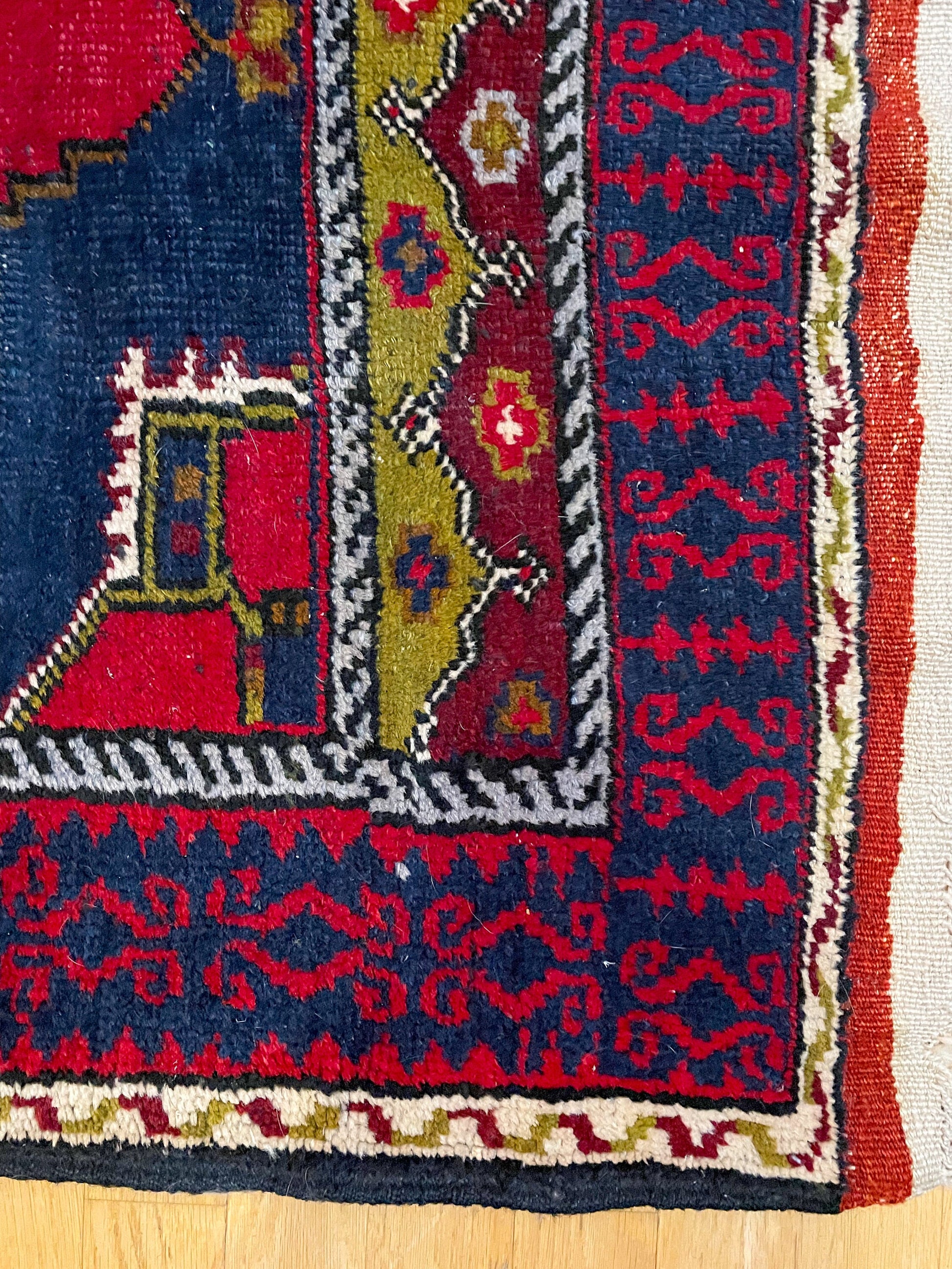 Fantastic vintage handmade rug, attributed to a village in Turkey, from the 1940's. Incredible quality, wool, rectangular area rug. Good size for an accent or an anchor piece. Geometric designs throughout, with navy blue, red and gold accents. Intricate design!