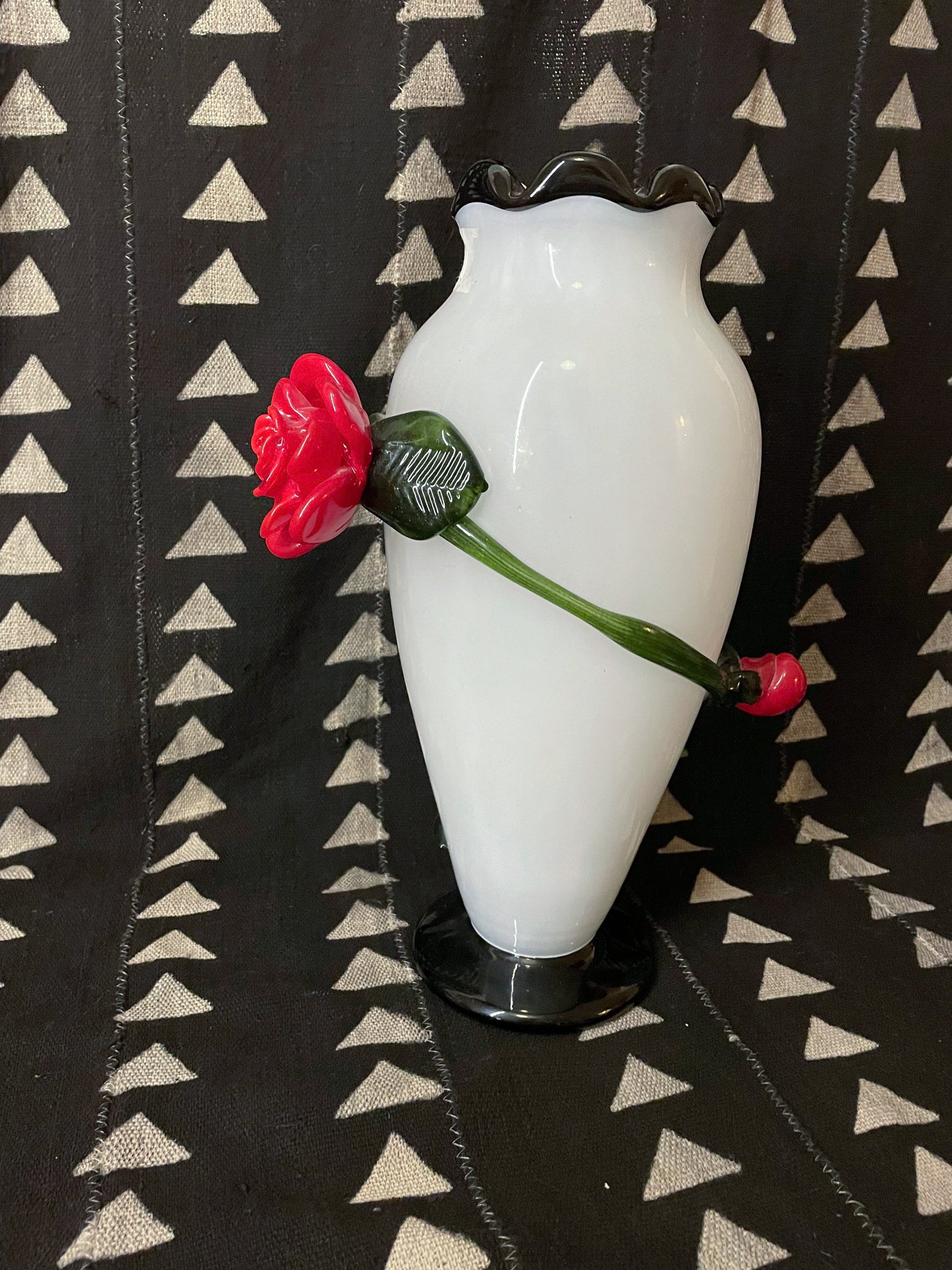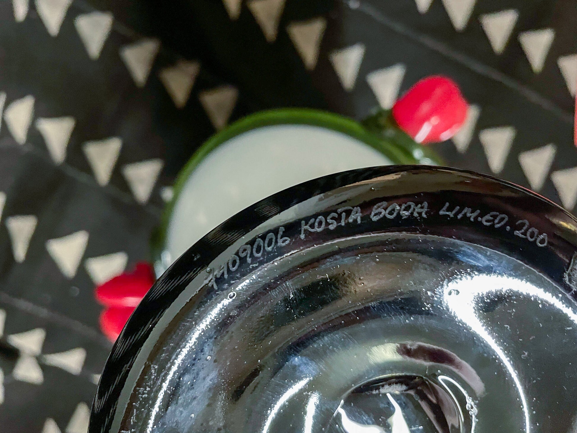 Designed by Ludvig Lfgren for Kosta Boda, part of the Old School Collection, inspired by traditional tattoos. Featuring two huge bright red roses and a transparent green 'vine' winding around the body of the vase, this is incredibly romantic. This piece is a limited edition, only 200 made, and retailed at $1,750 (original tag included!)