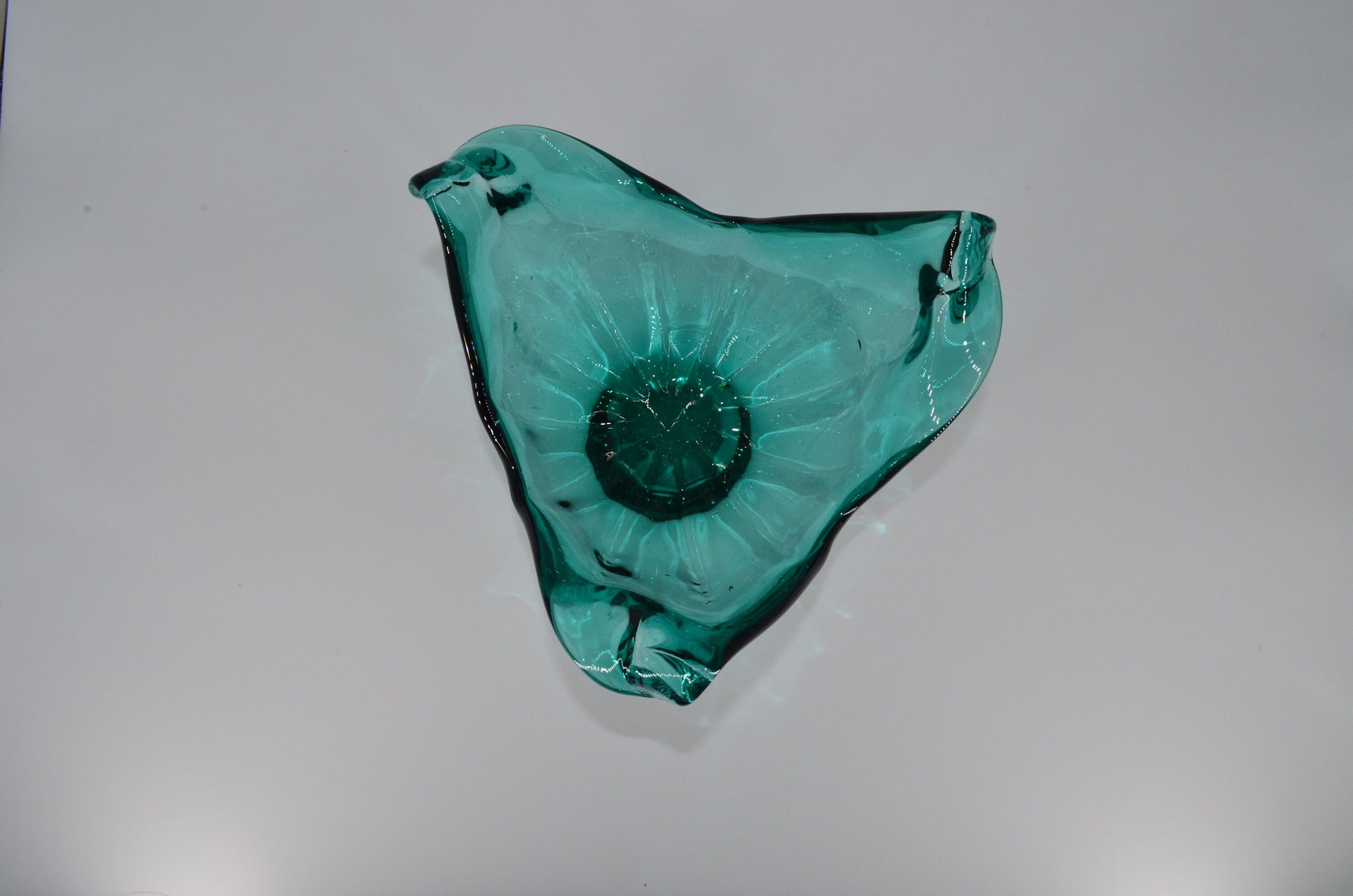 This gorgeous, heavy bowl features three distinct points that are masterfully curled at the tips. It's a teal color, close to aqua, and consistent throughout.