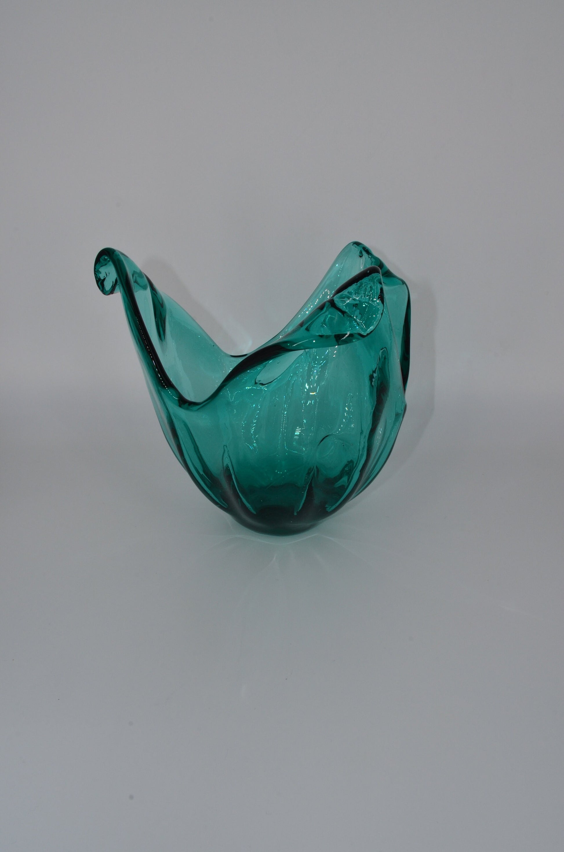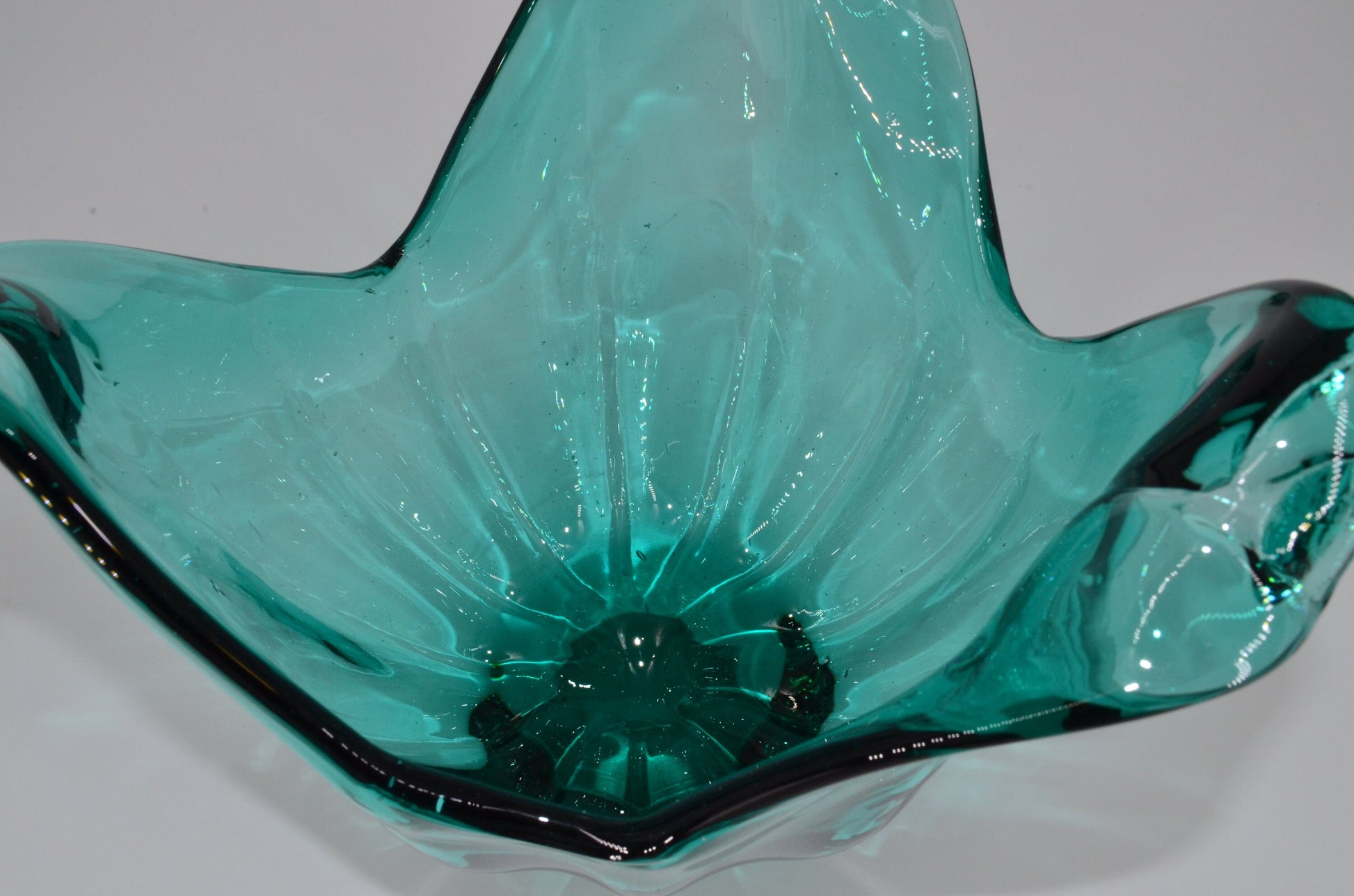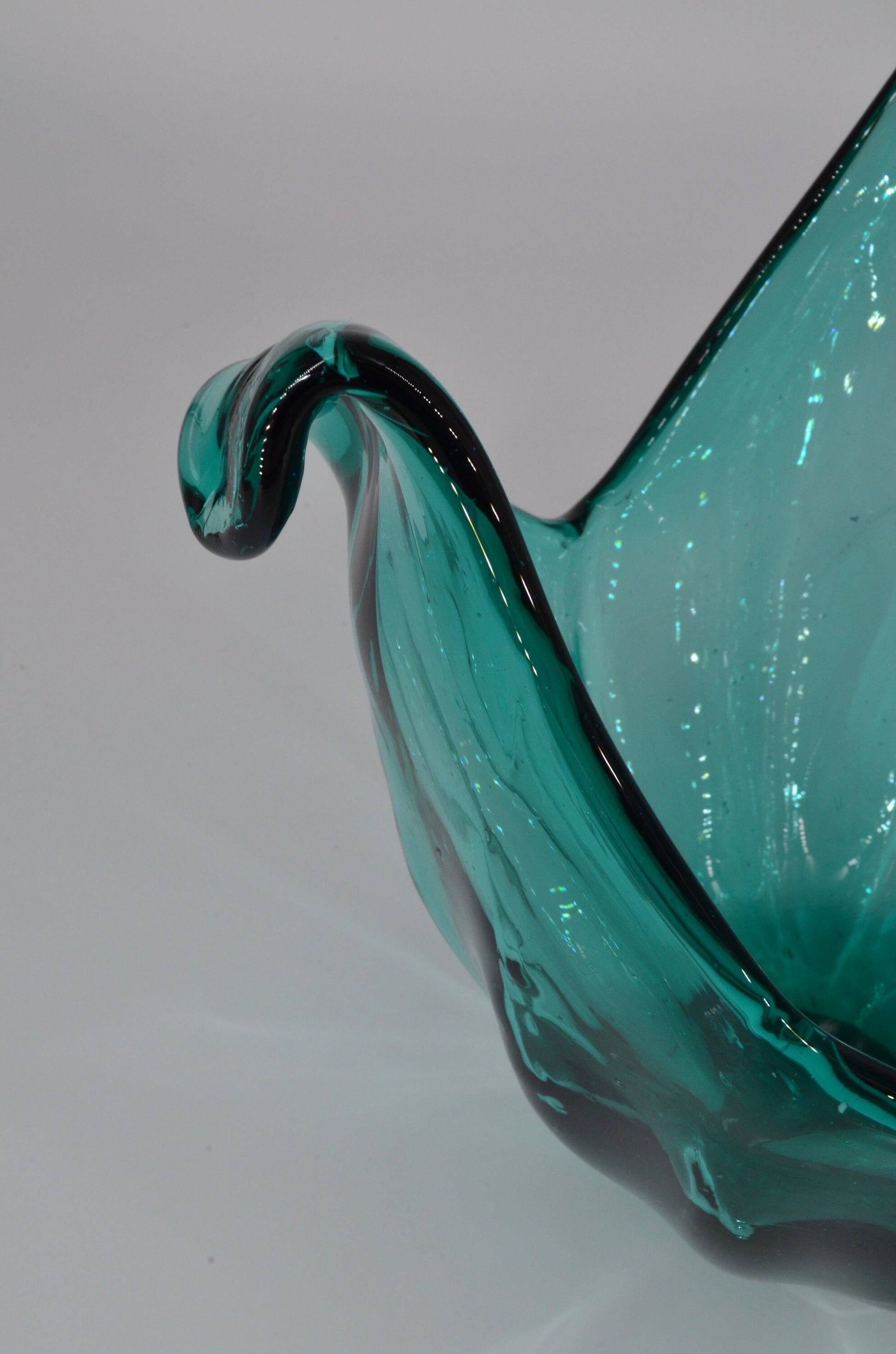 Huge Vintage Italian Glass Bowl - Handmade in Murano - Teal Curly Vase - Centerpiece Vase