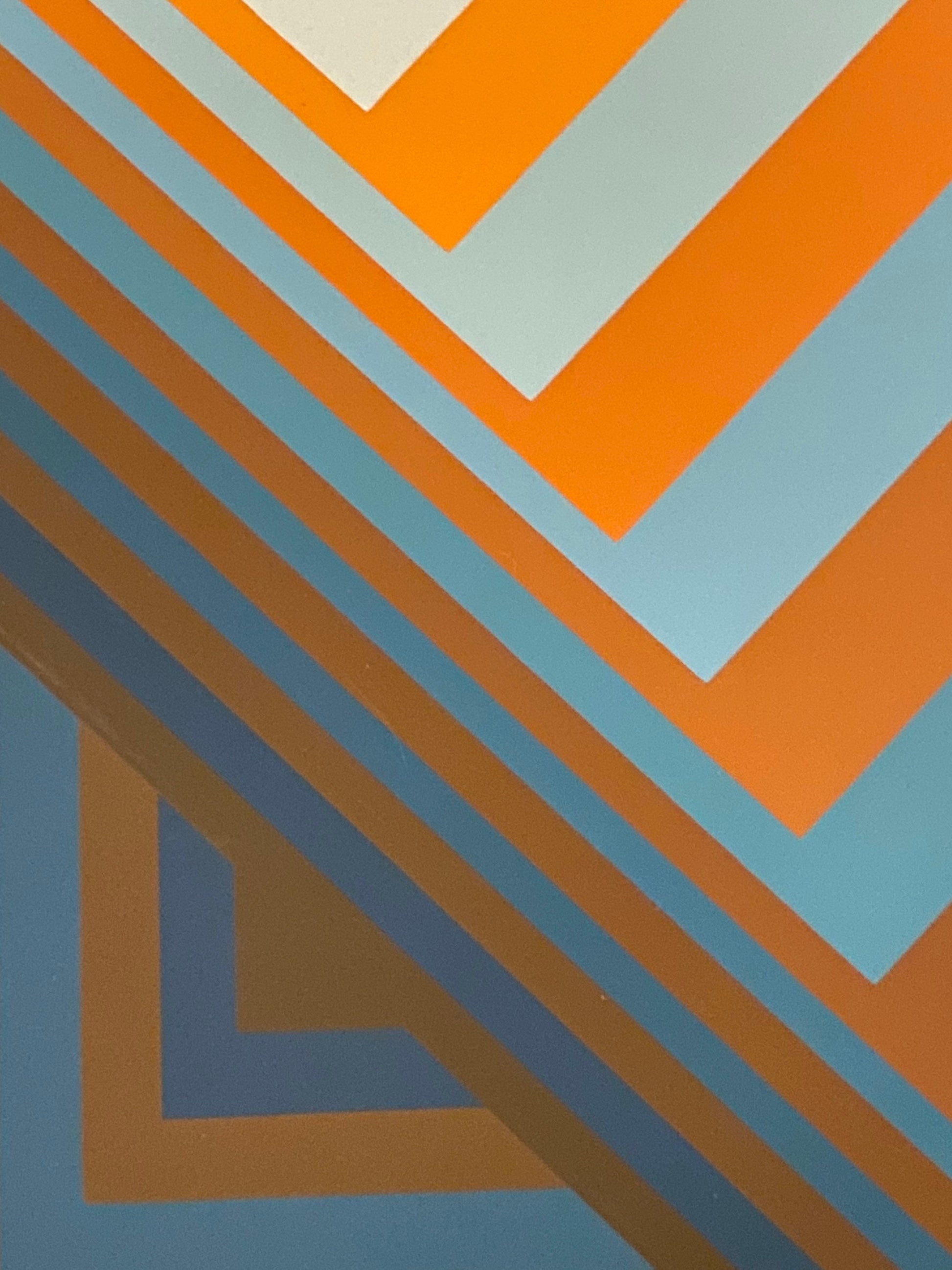 A complete stunner! This unique, limited edition geometric and optical illusion piece will make a statement in any space. Small enough to be an anchor on a wall composition, large enough to hang on its own. The colors are eye-popping, I tried to capture them in different light. Message me if youd like more images.