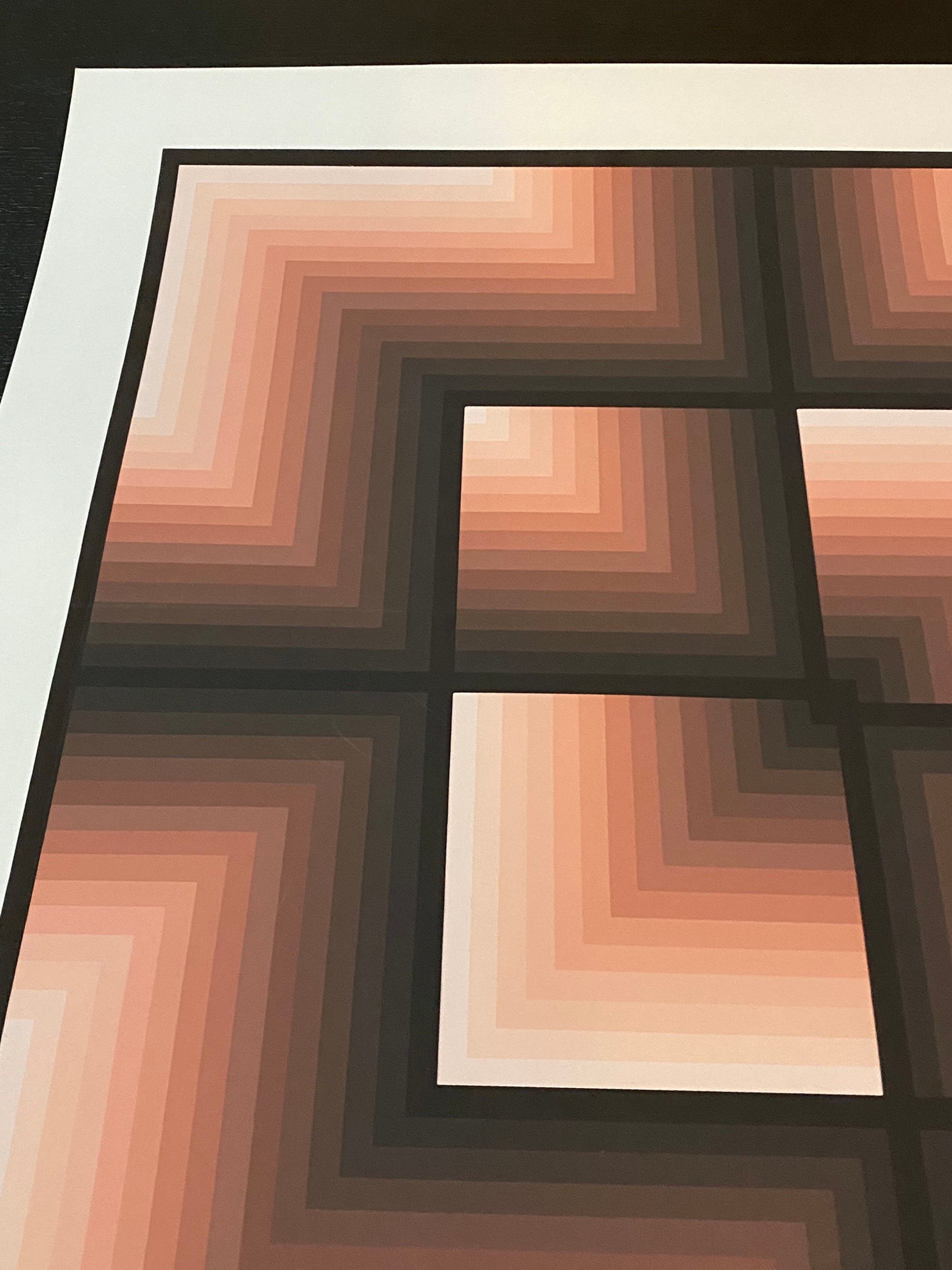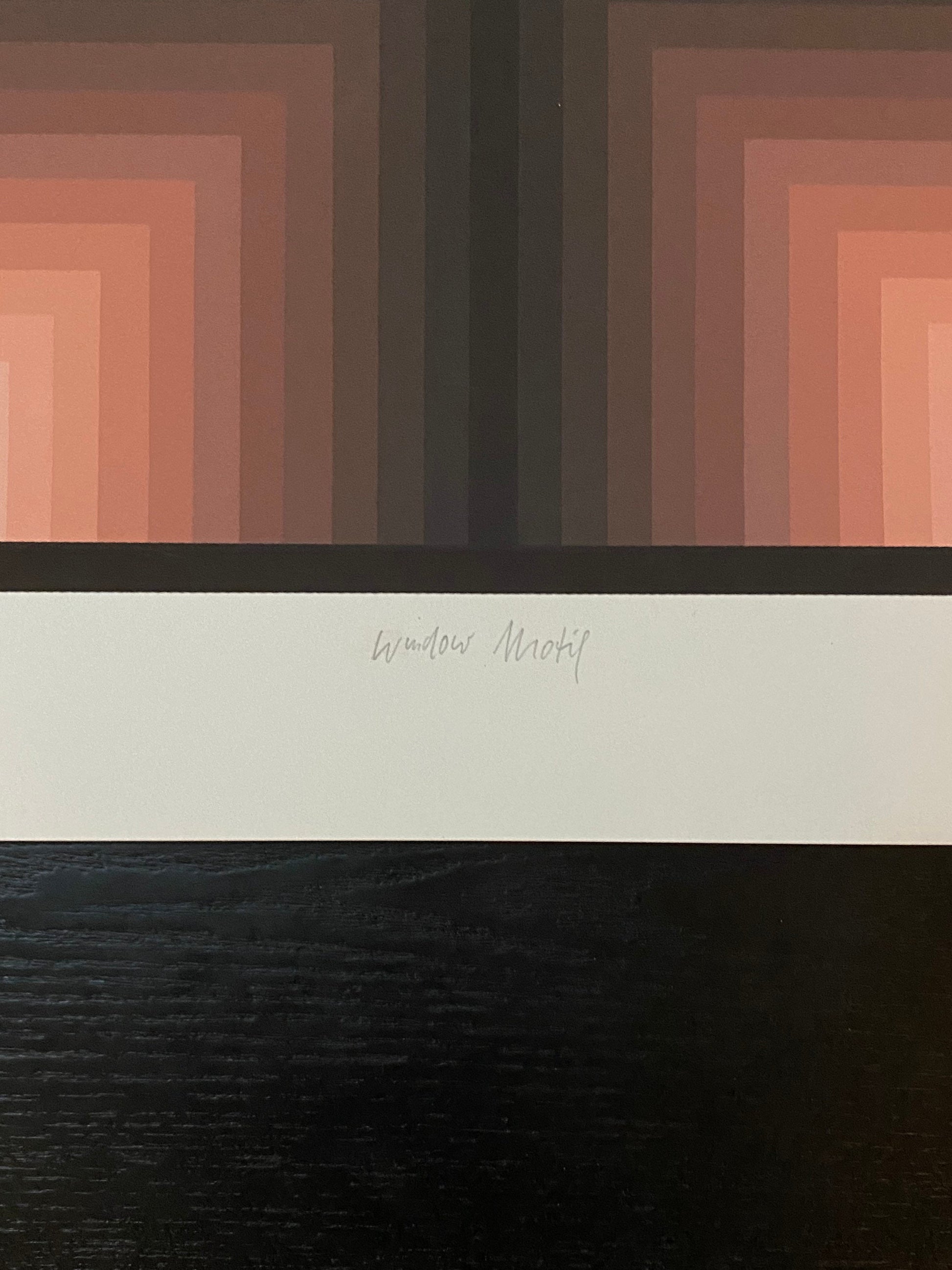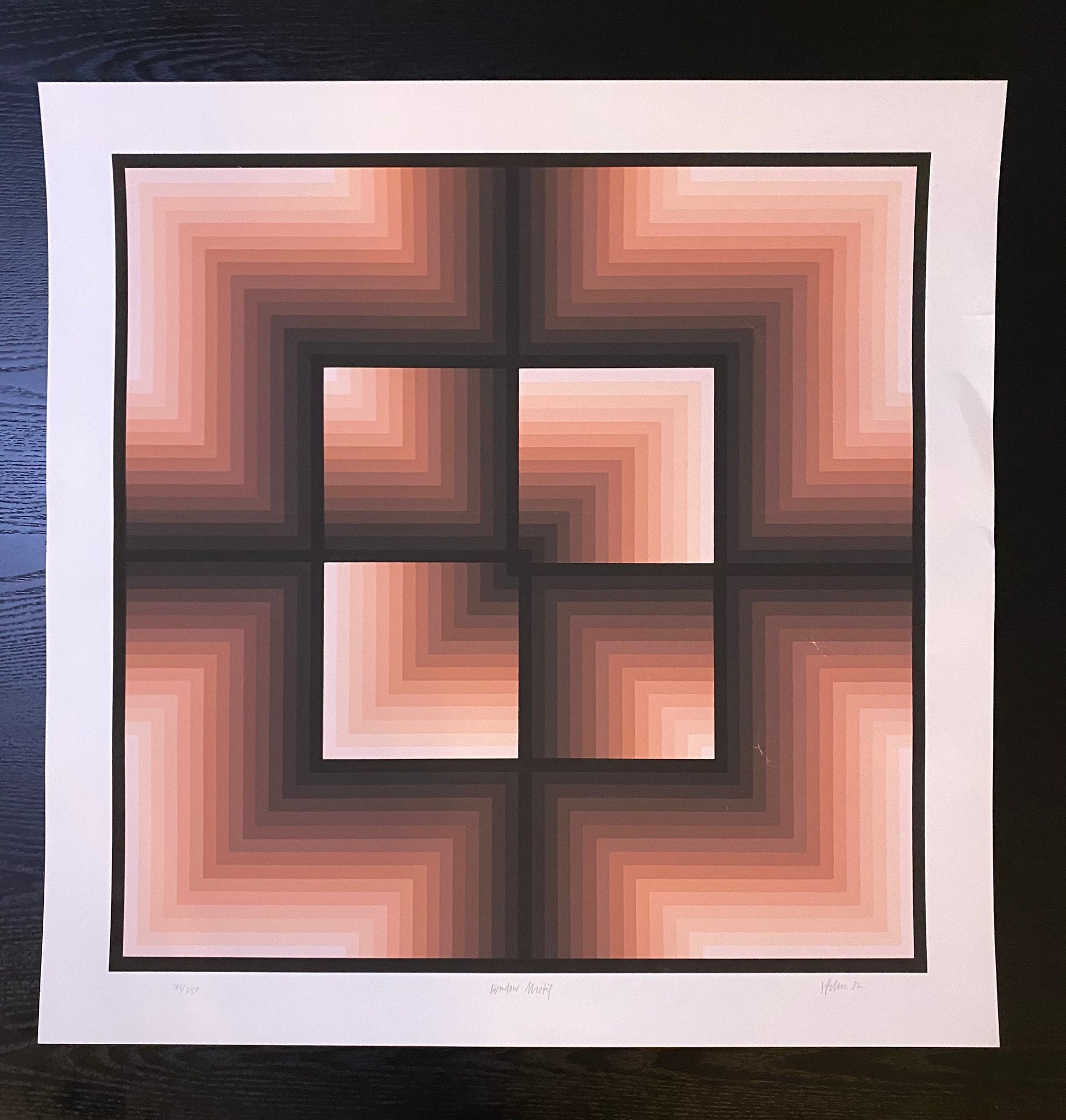 Limited edition silkscreen print from German-born renowned optical, graphic artist Jurgen Peters. This print titled Window Motif has depth! Depending on the lighting and the angle, you may just get the urge to jump right in! I took pics in different light to show the subtle ink nuances throughout. Bound to pickup colors of whats surrounding it, add this geometric beauty to your collection today.
