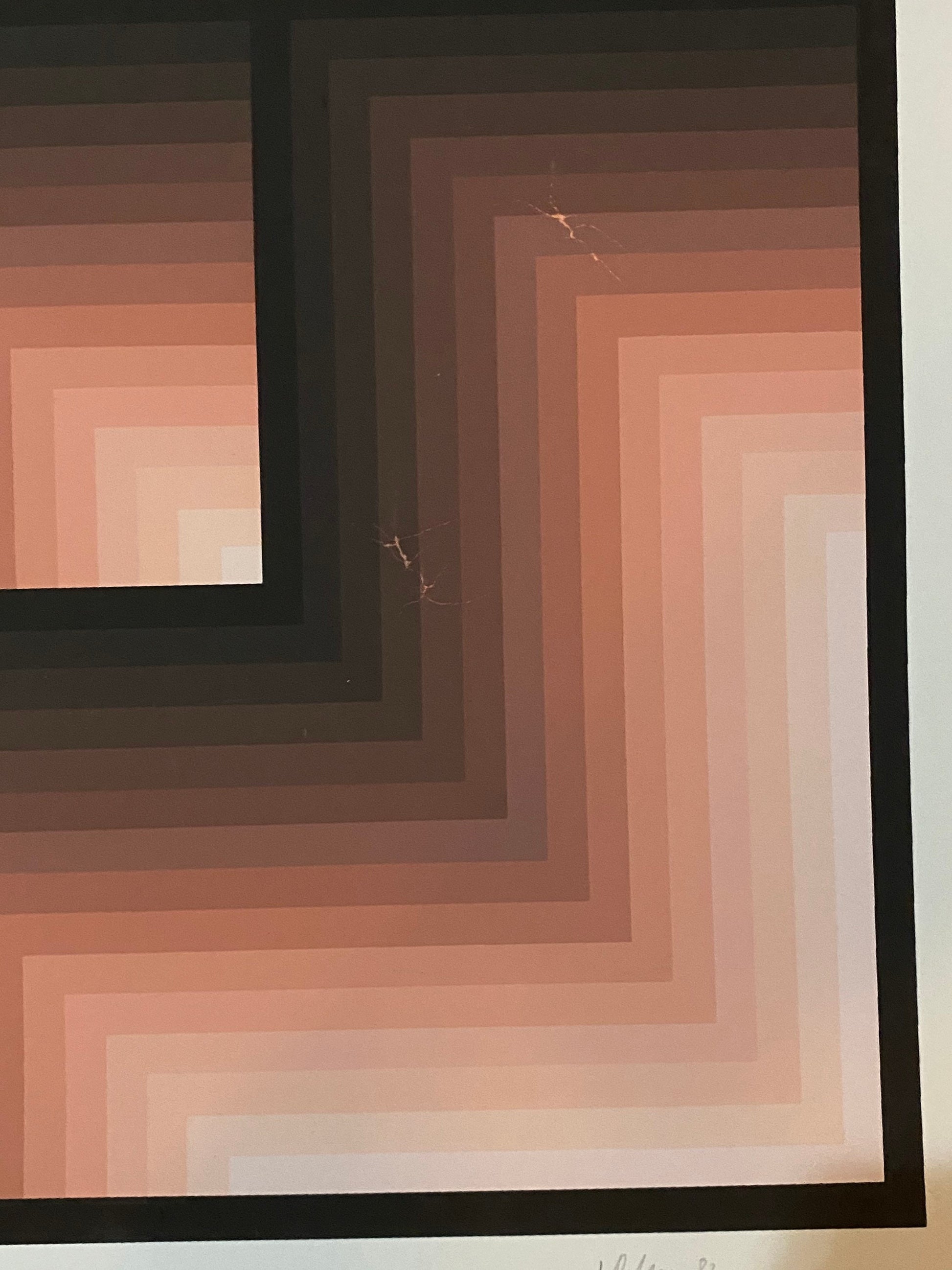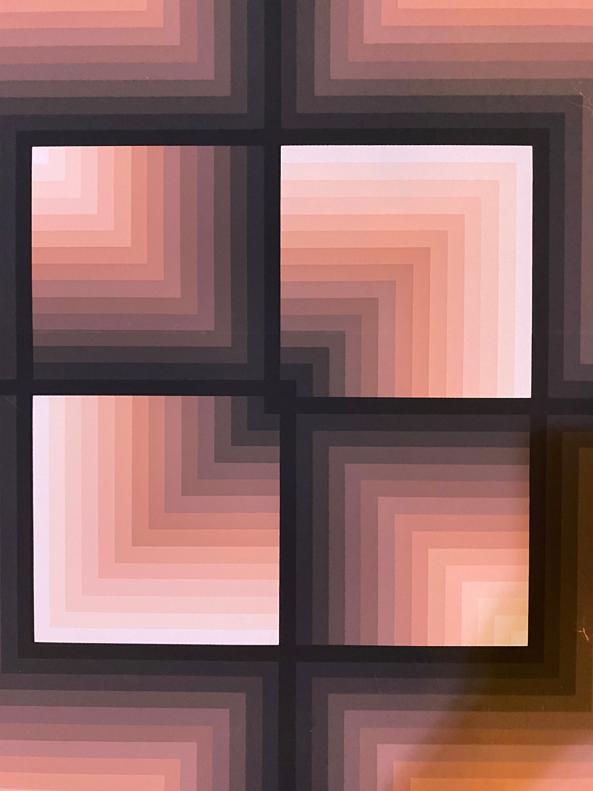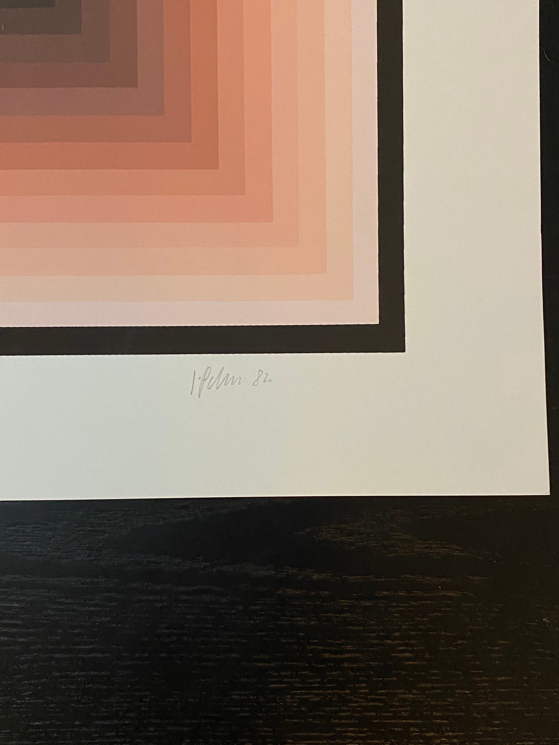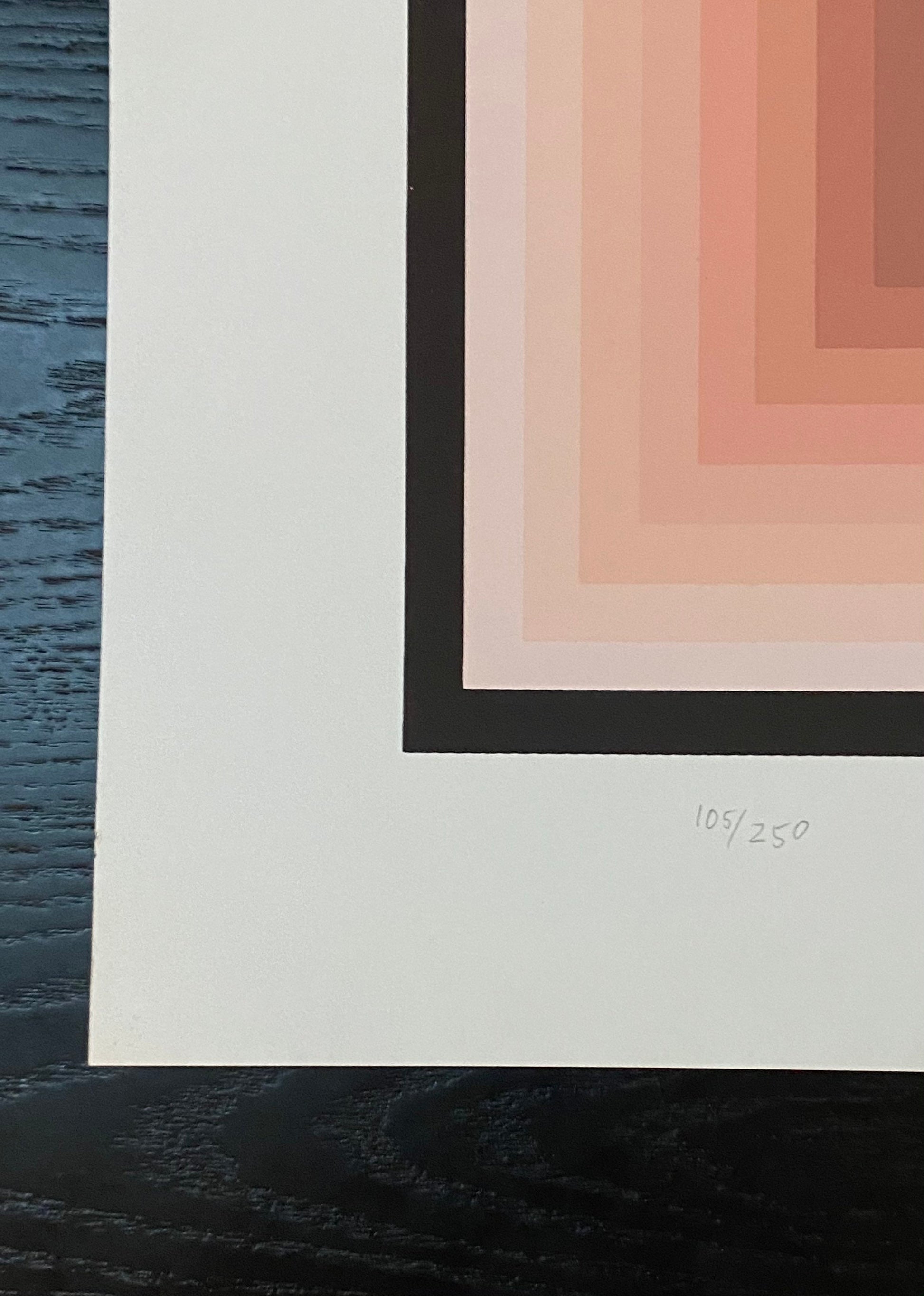 Limited edition silkscreen print from German-born renowned optical, graphic artist Jurgen Peters. This print titled Window Motif has depth! Depending on the lighting and the angle, you may just get the urge to jump right in! I took pics in different light to show the subtle ink nuances throughout. Bound to pickup colors of whats surrounding it, add this geometric beauty to your collection today.