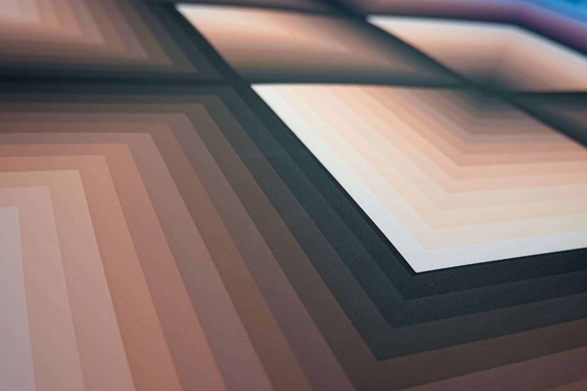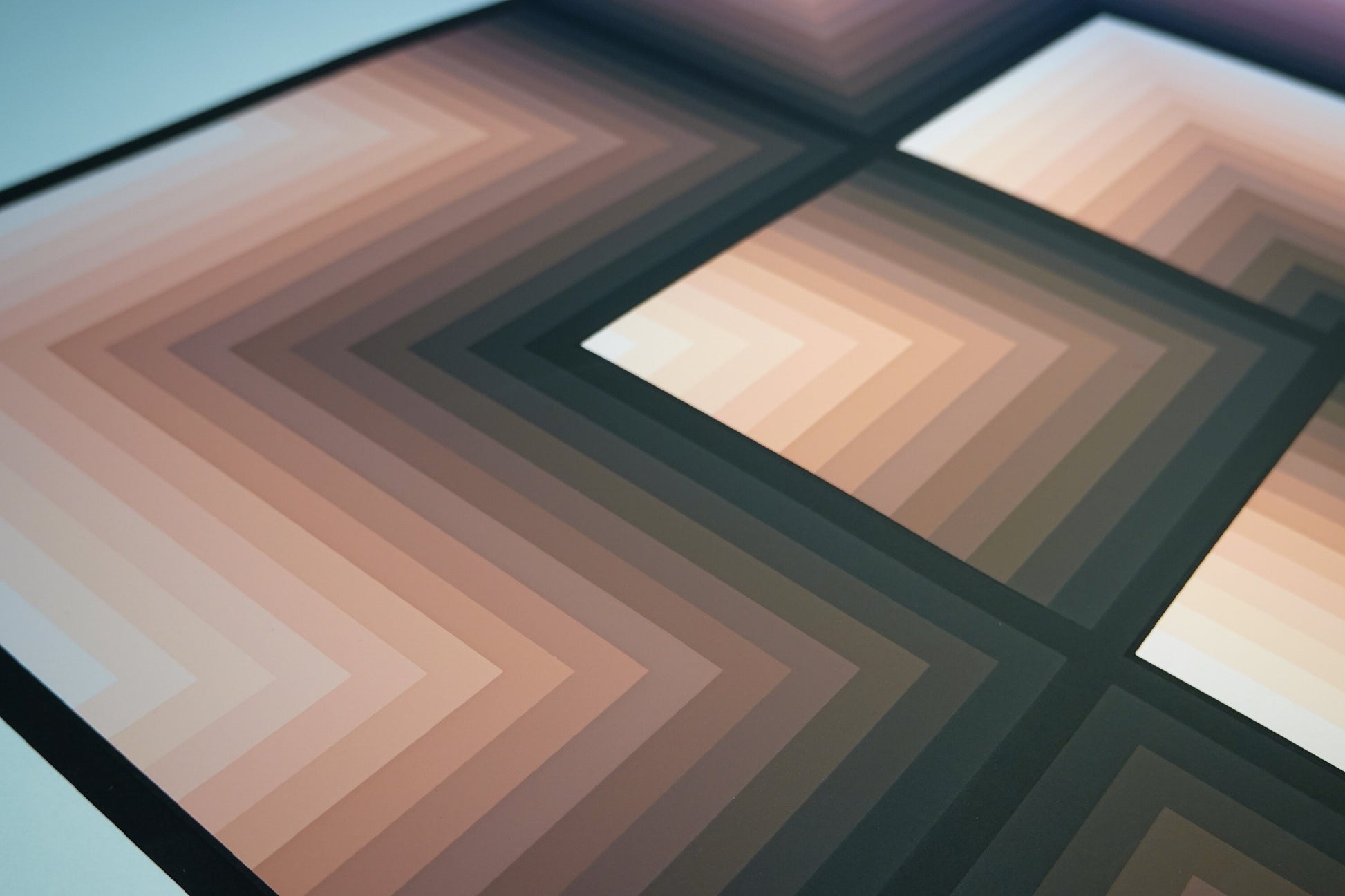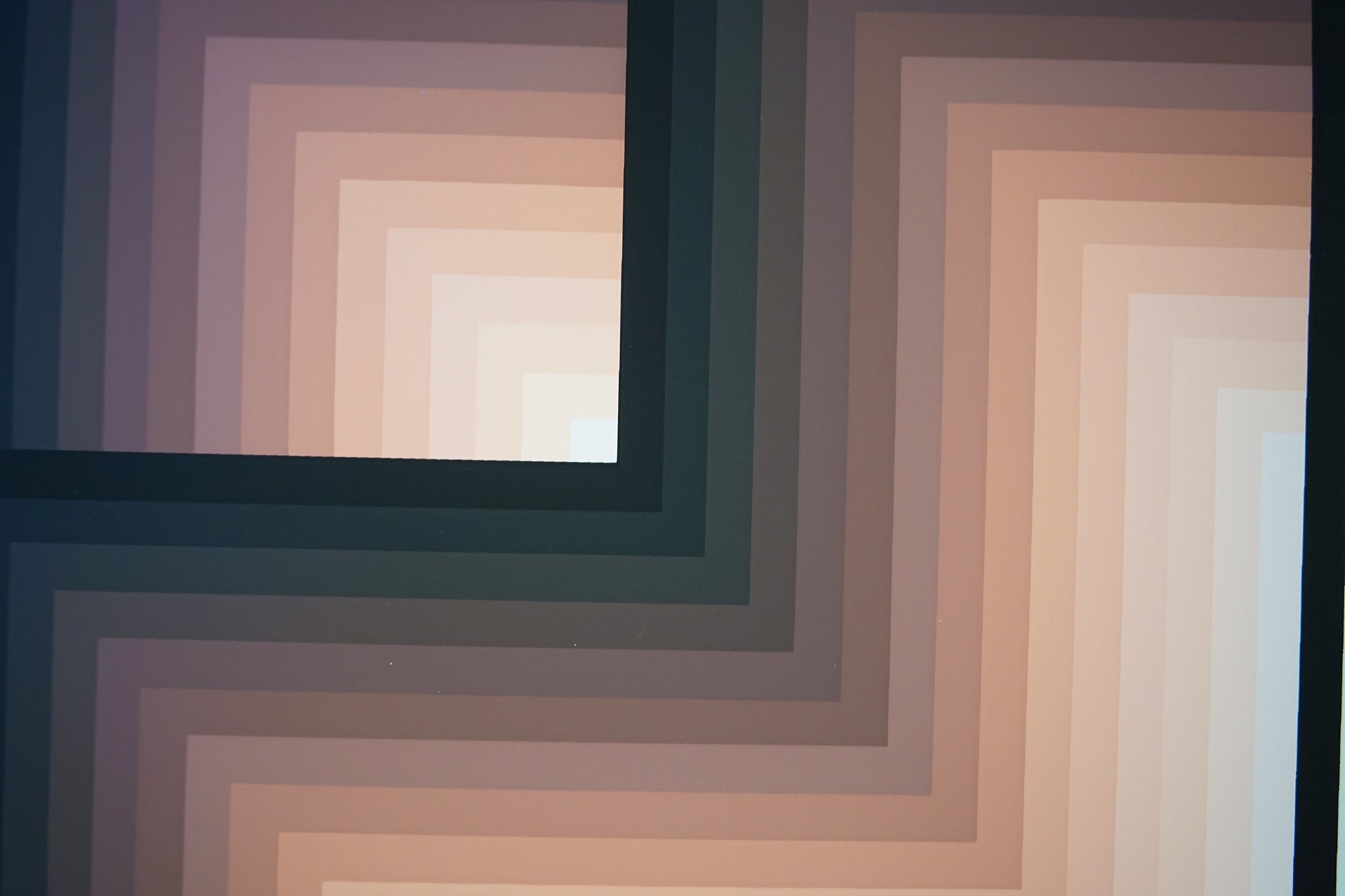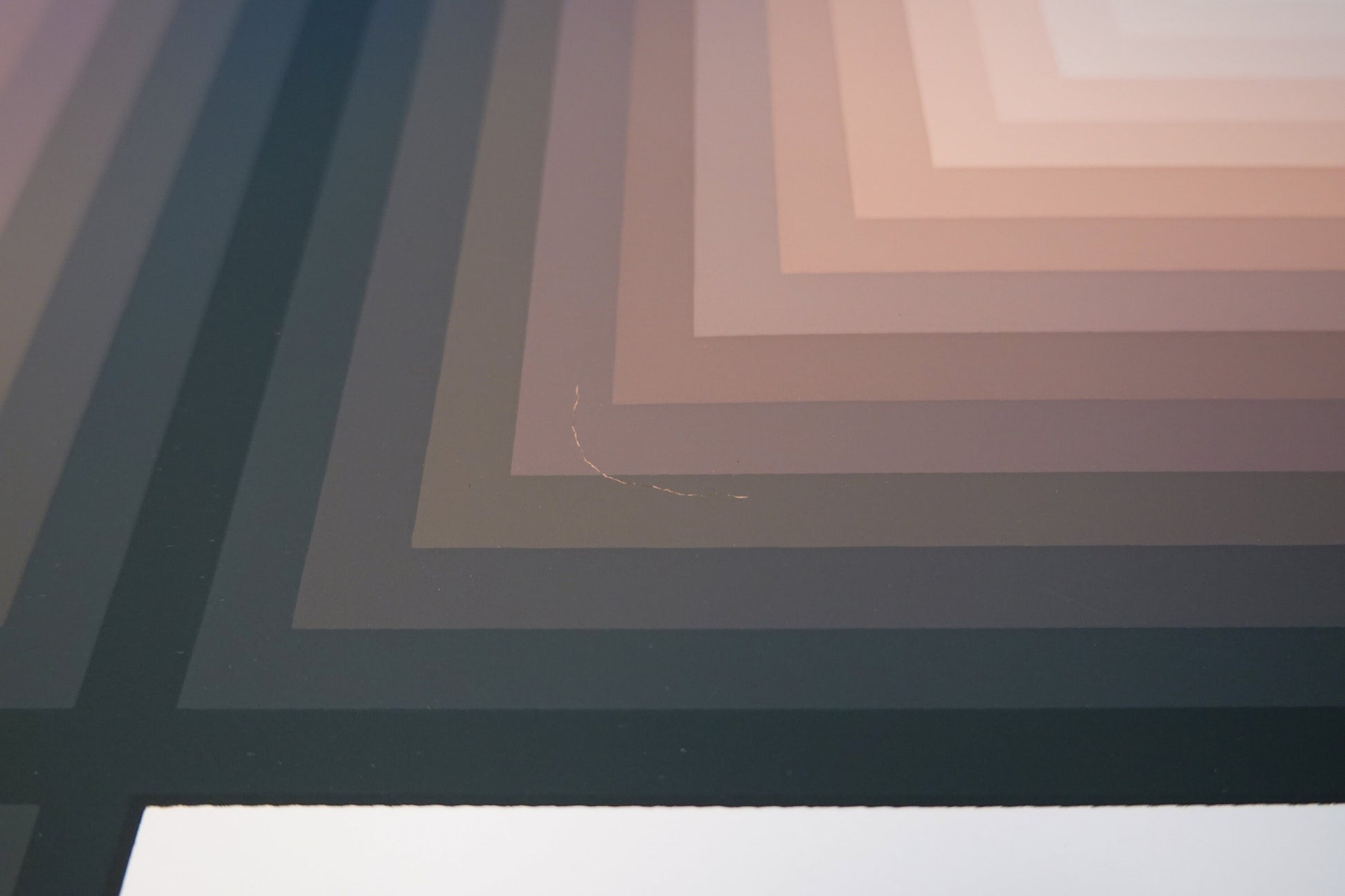 Limited edition silkscreen print from German-born renowned optical, graphic artist Jurgen Peters. This print titled Window Motif has depth! Depending on the lighting and the angle, you may just get the urge to jump right in. I took pics in different light to show the subtle ink nuances throughout. Bound to pickup colors of whats surrounding it, add this geometric beauty to your collection today.
