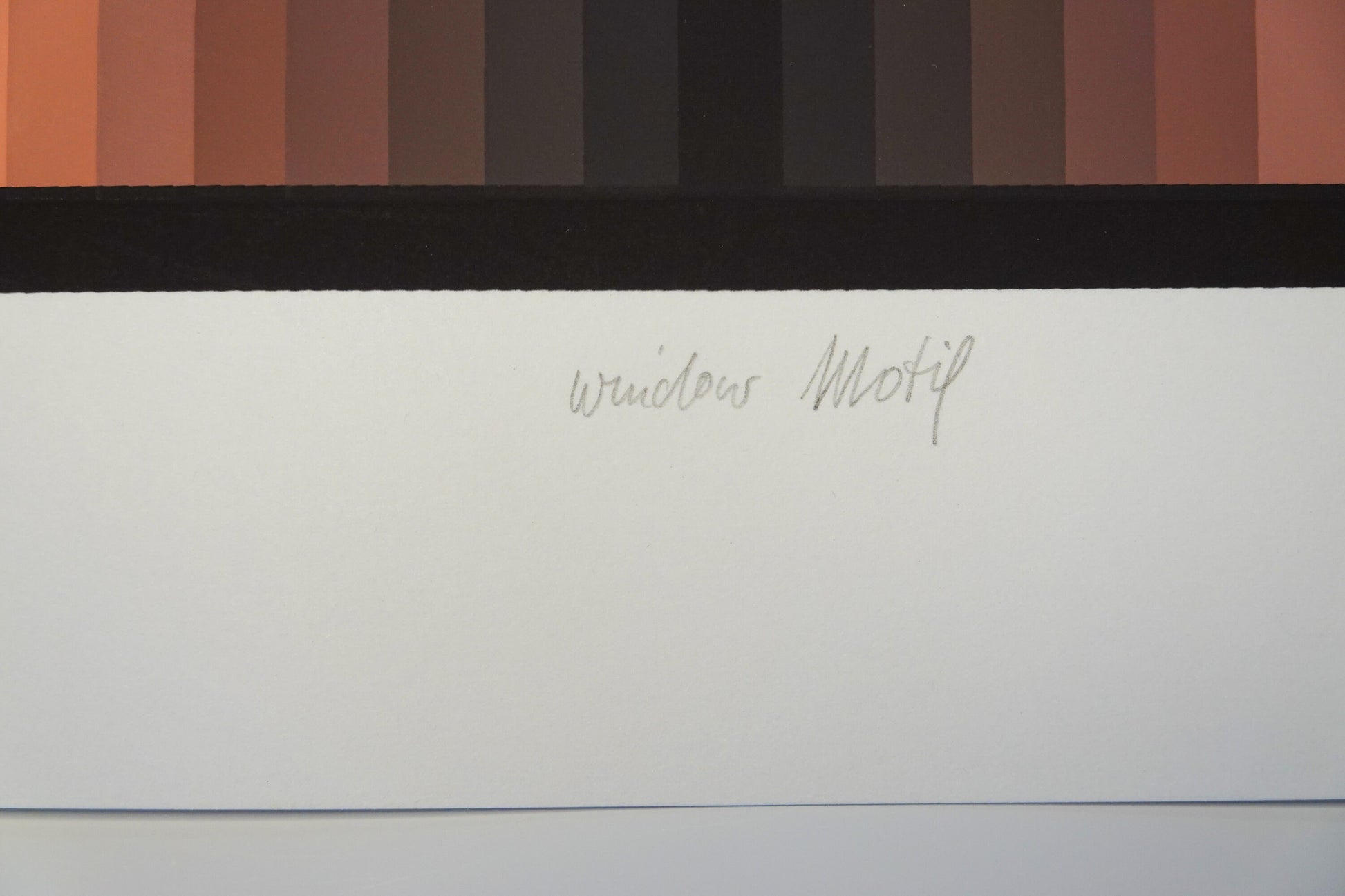 Three pencil marks on the bottom. Numbered "122/250" on the left, middle is the title of the piece: "Window Motif" and on the right is the artists signature.