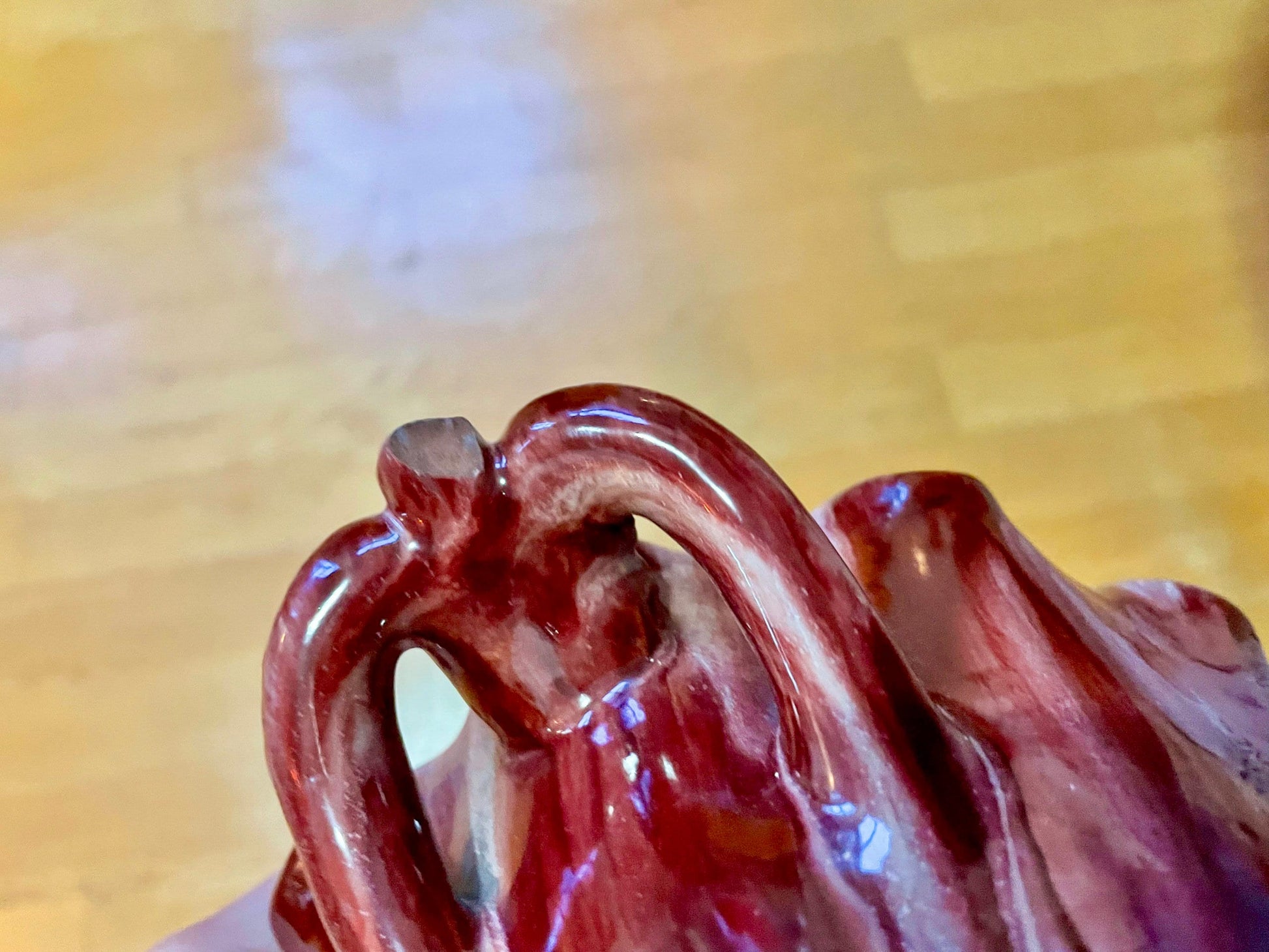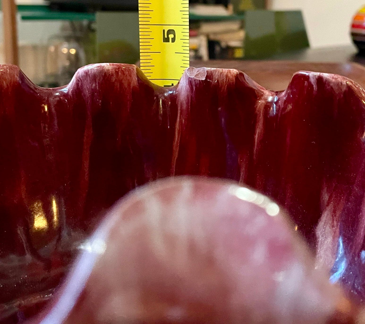 Some crazing on interior bottom of piece. One chip on underside of handle. One chip on the top interior, about 1/4 inch long, in photo with measuring tape. Interior facing but somewhat visible from the exterior of the piece. Priced accordingly. This is typical of his works, ones that are totally pristine are museum-quality.