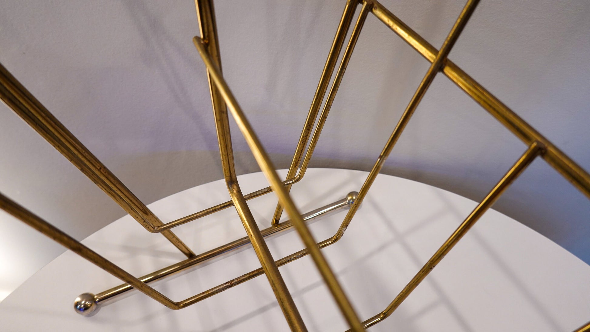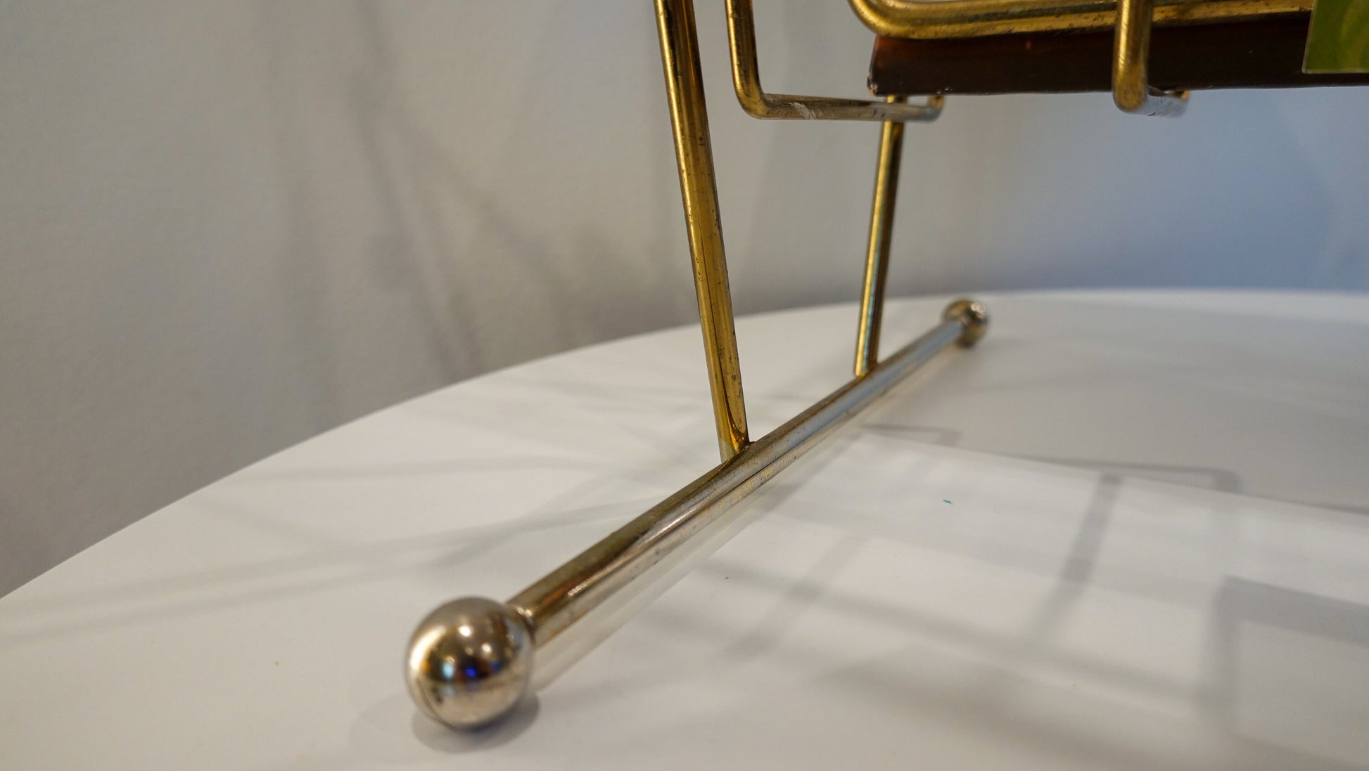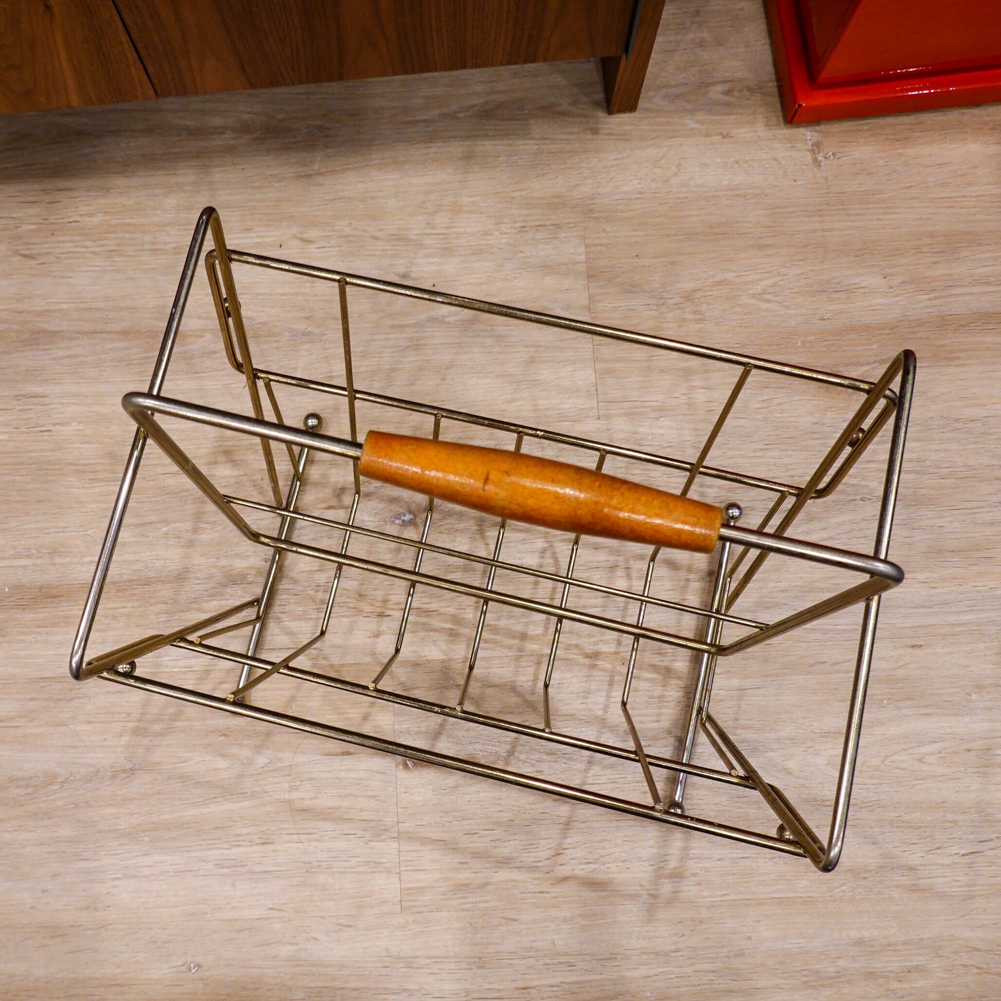 Metal, brass-toned atomic storage rack with handle. Featuring sphere finishes, this thick gauge wire rack is perfect for storing magazines, records, scrapbook paper, or anything else you can think of. It has a wood handle for easy portability around the home. Tapered and angled shape, incredible design demonstrative of the era. No exact date, but made between 1940-1970. Free shipping!