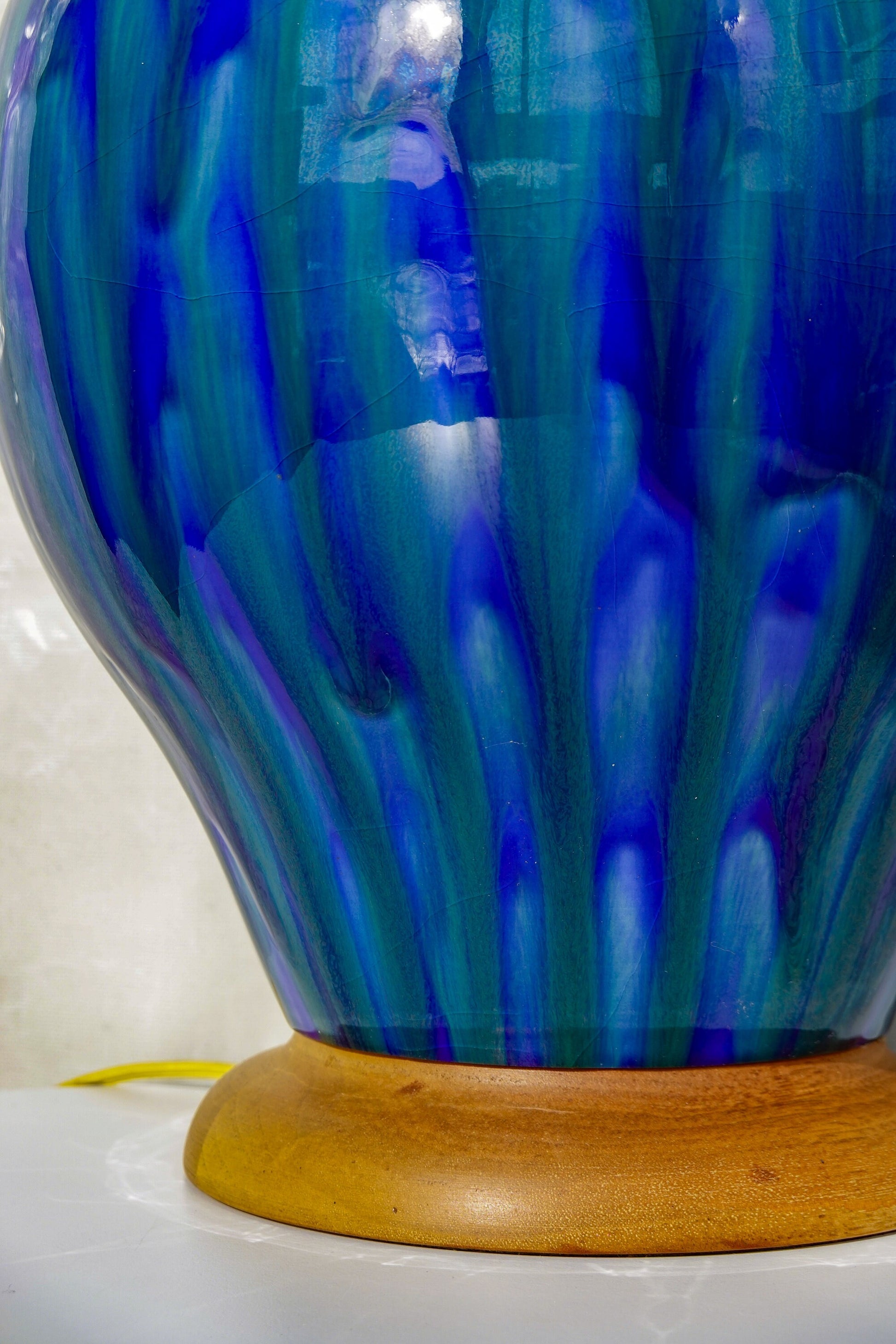 This super large lamp is 32" tall, has a gorgeous bulbous shape and quintessential mid-century modern shaped shaft, made of walnut, and a walnut base. With brass hardware and a Peacock is the first word that comes to mind when I see this piece, the turquoise, cobalt and deep green drip glaze is spectacular. **Must watch the 15 second video, the photos don't do the colors justice!