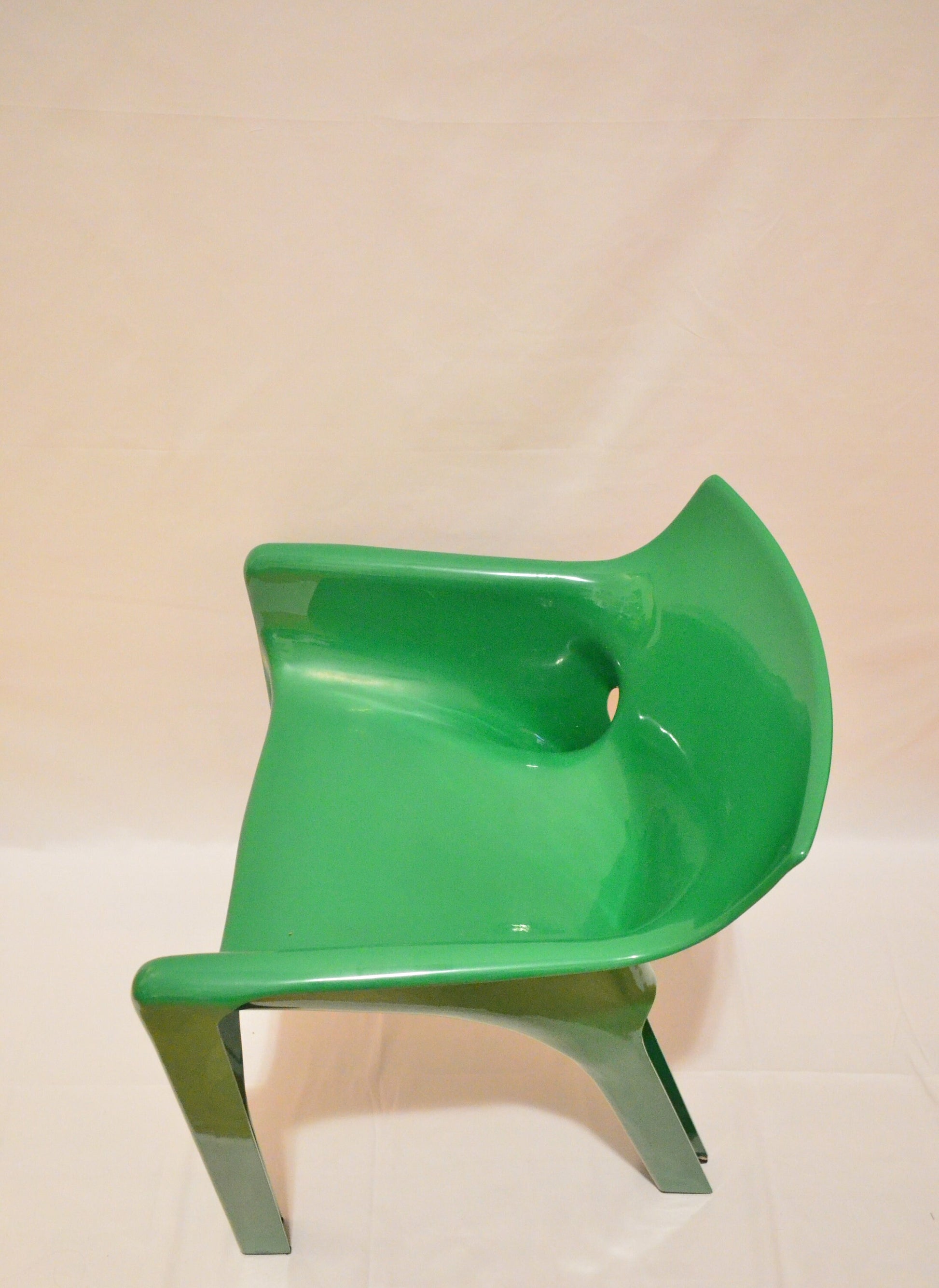 The green is a rare color, and even more rare is the removable vinyl cushion included with the chair. The chair itself is made of GRP (fiberglass reinforced polyester), and shows some minor wear/scratches consistent with age. None worth noting here. It's easy to clean and maintain.