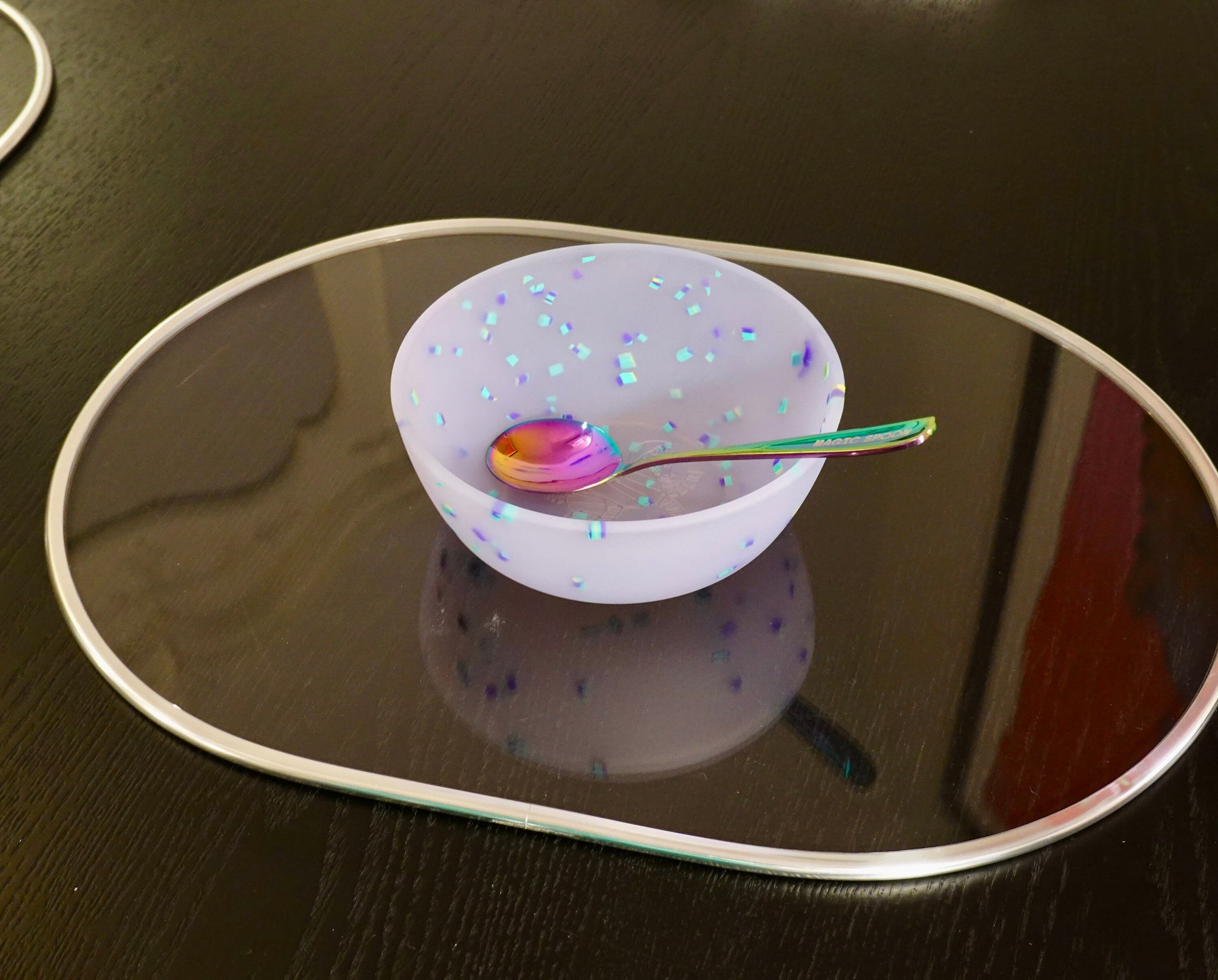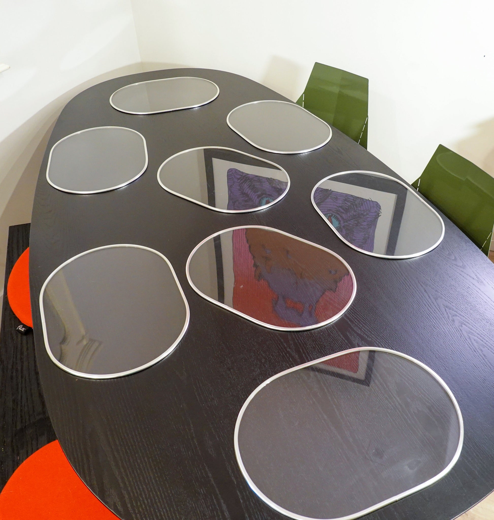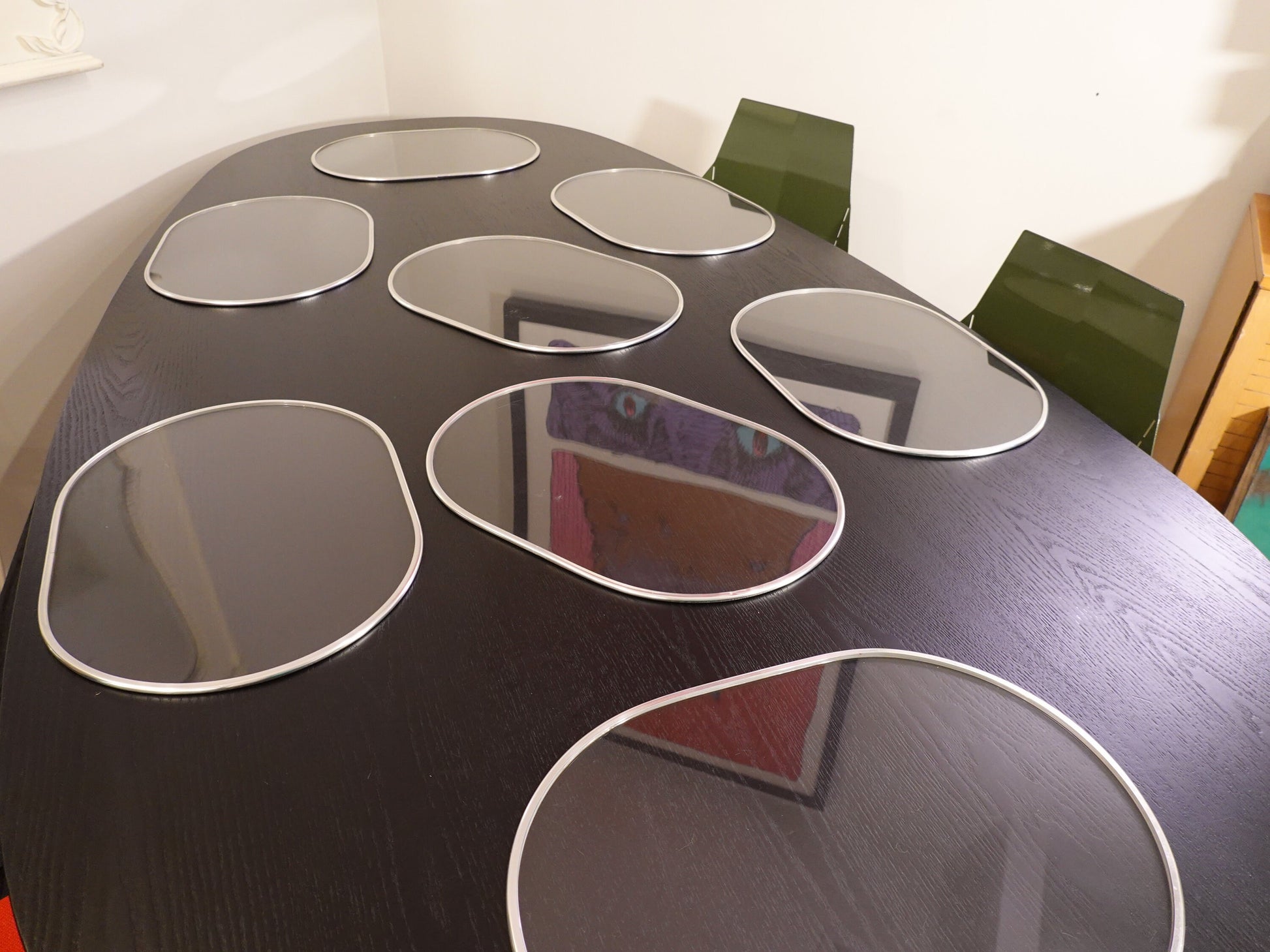 Clear acrylic placemats rimmed with metal, for your everyday needs. Perfect for entertaining, there are 8 available. ONLY 2 LEFT!