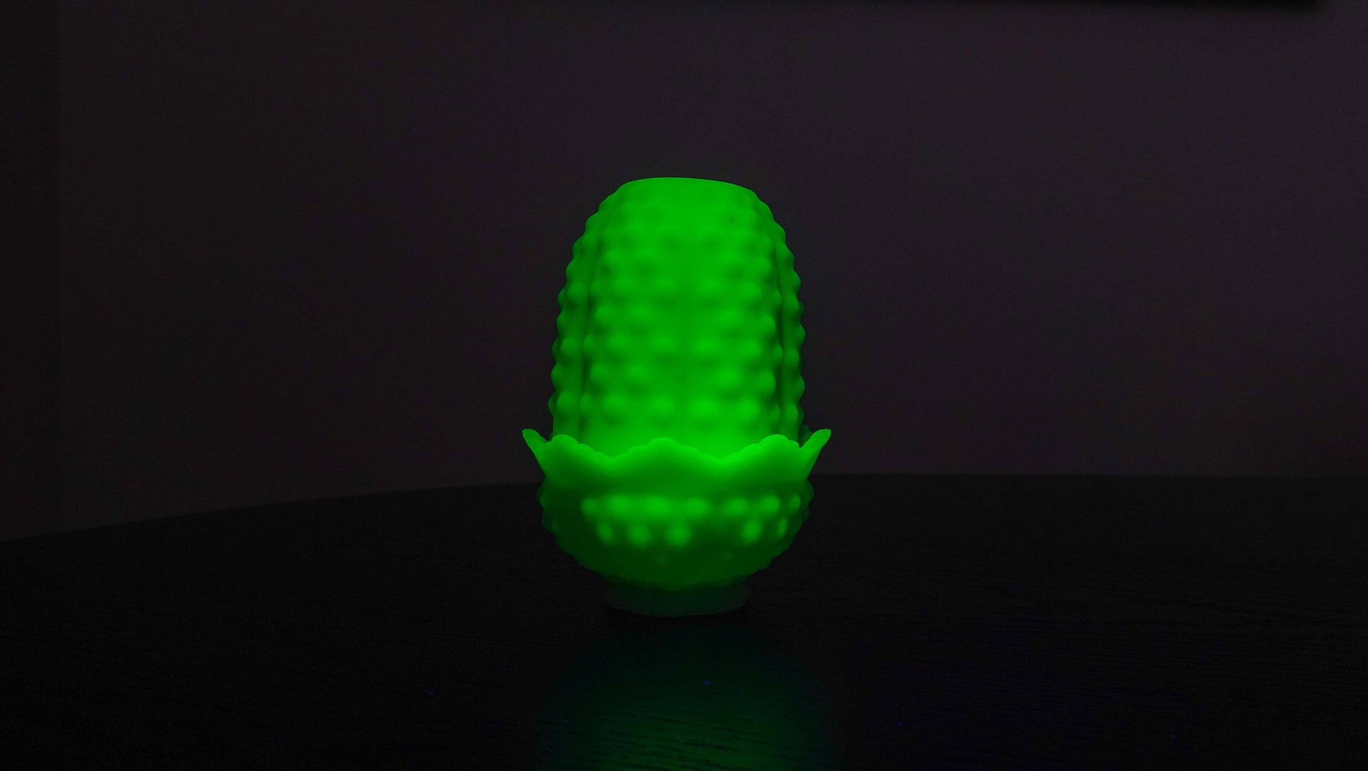 Vaseline glass has incredible depth and looks different under different lighting conditions. I included many in my photos! The video was taken in near-dark conditions.