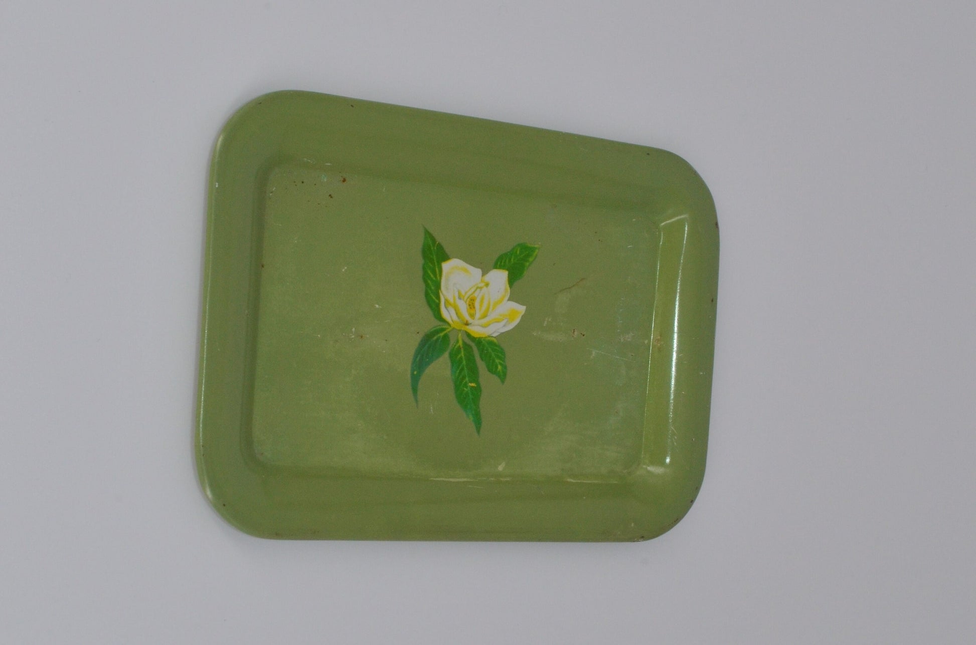 Green metal tray with a solitary white flower that has leaves painted in the middle. Pretty little thing, I used to have one like it as a young girl and it was very fun - one of my first "interior" purchases I remember! Get this gem for the young ones in your life - it's a great size for small hands - or use it yourself.