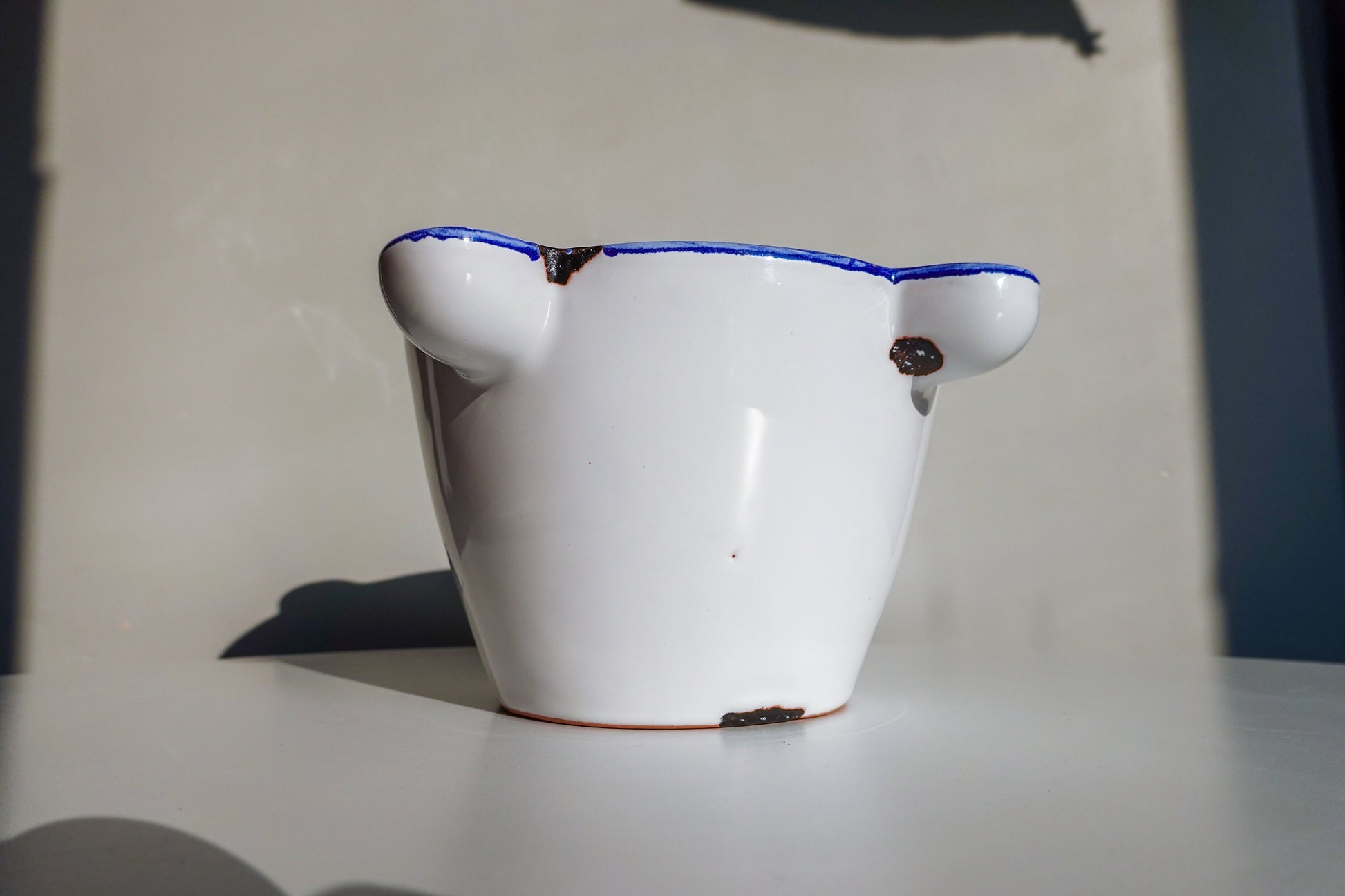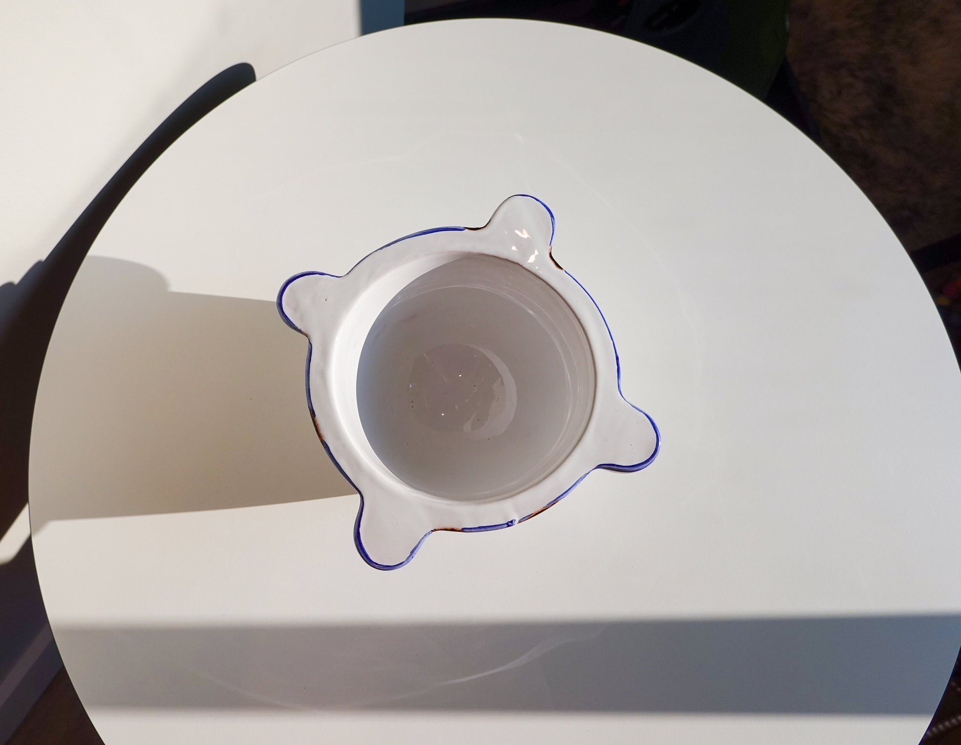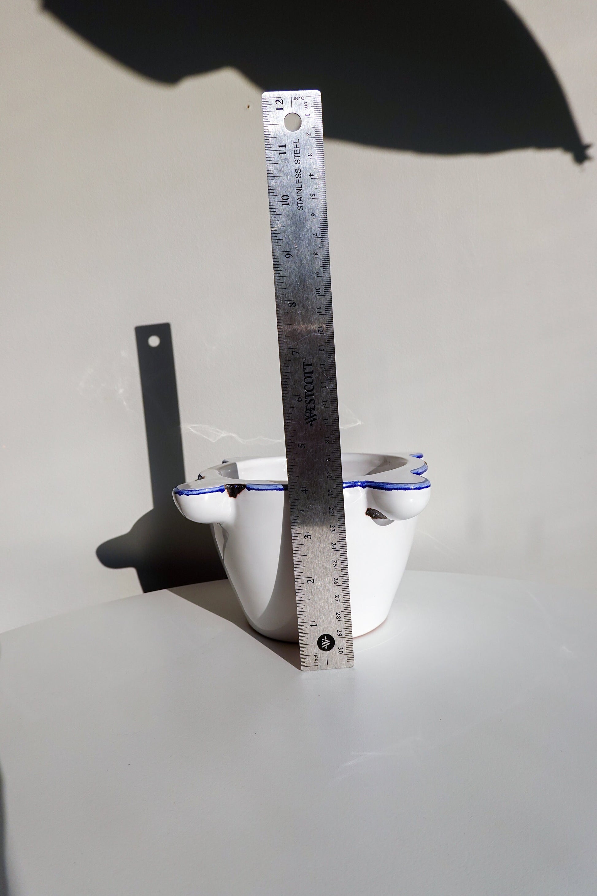 Interesting shaped low vessel, featuring bright white and cobalt blue emblematic of the Italian Amalfi Coast. It is round, but has round spherical edges, creating a super interesting and unusual shape. Made of terracotta and finished in a high-gloss white, this is double-walled and sealed at the top and bottom. Quite heavy for its size.It was potentially once a mortar, but it's the perfect size for a catch-all bowl, or a succulent planter, serving bowl, etc! See detailed measurements below.