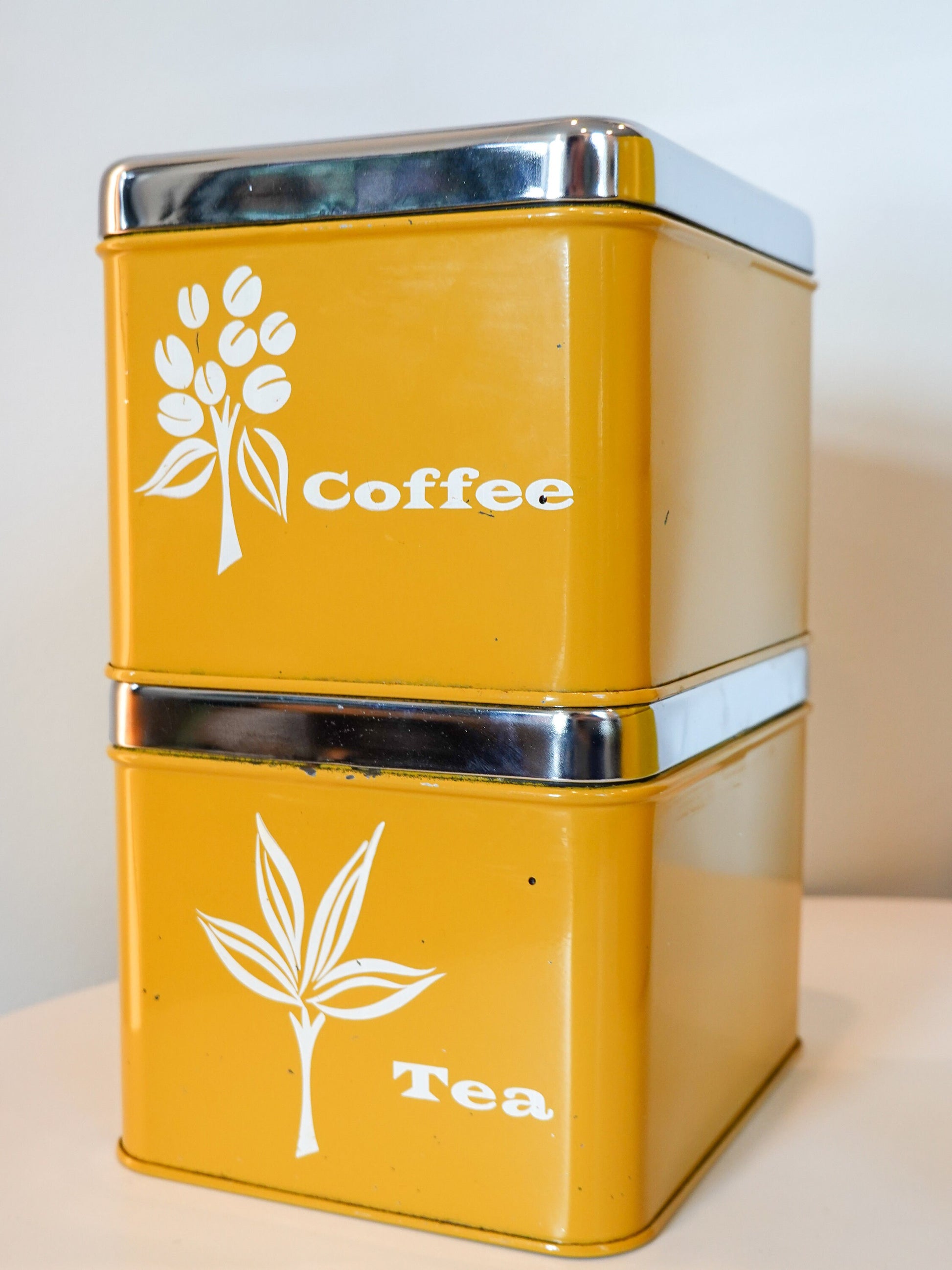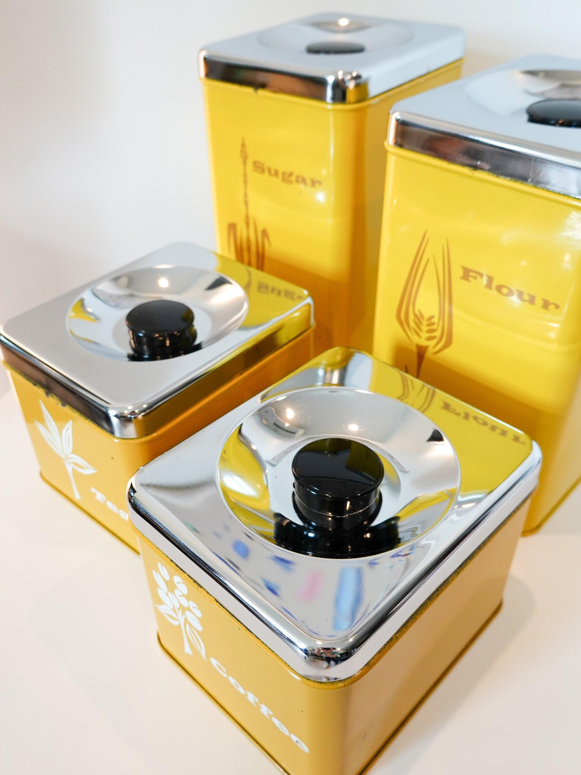 Vintage Kitchen Canisters - Lemon Yellow and Burnt Orange Painted Metal - Midcentury MCM Kitchen Set