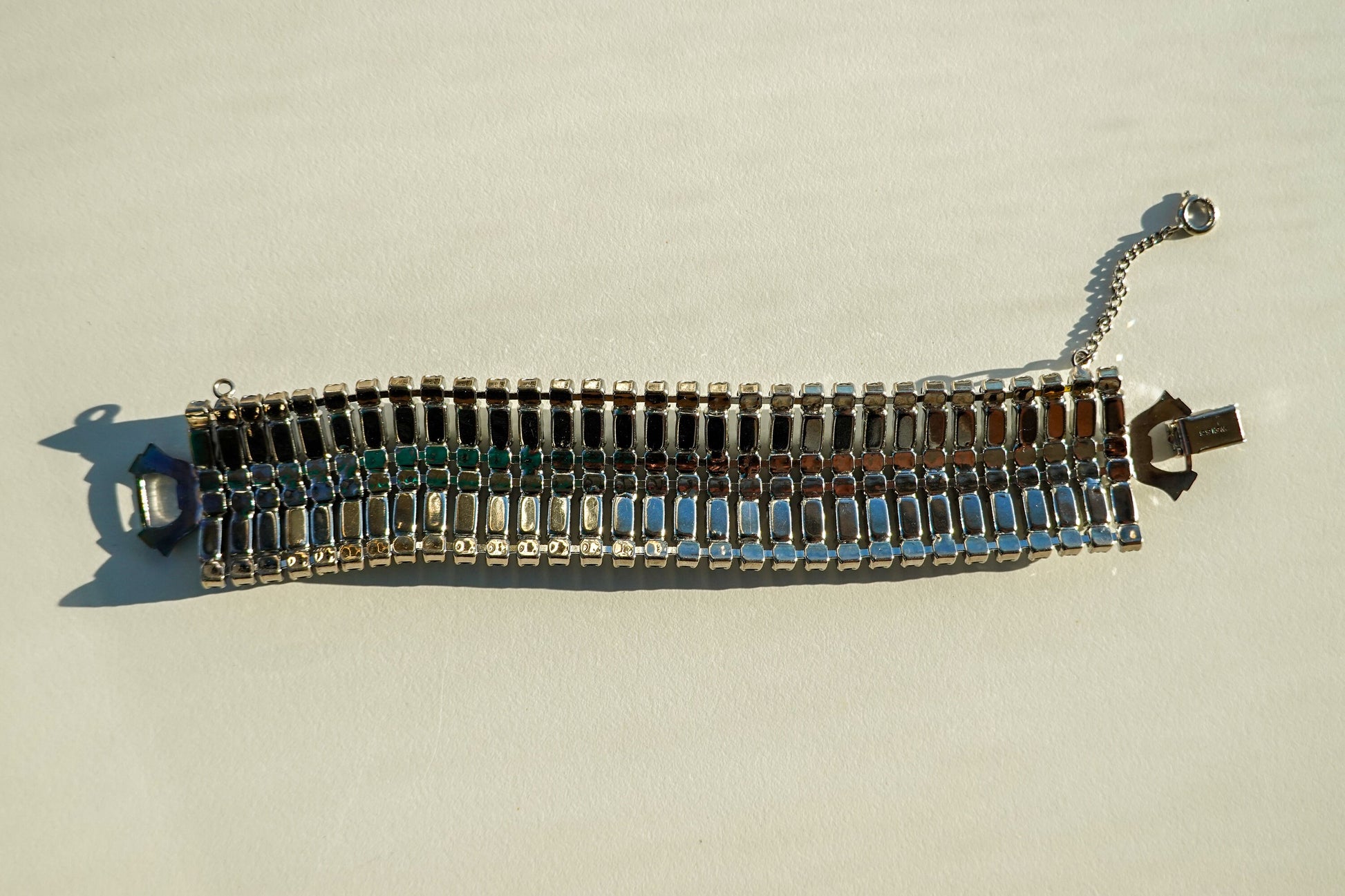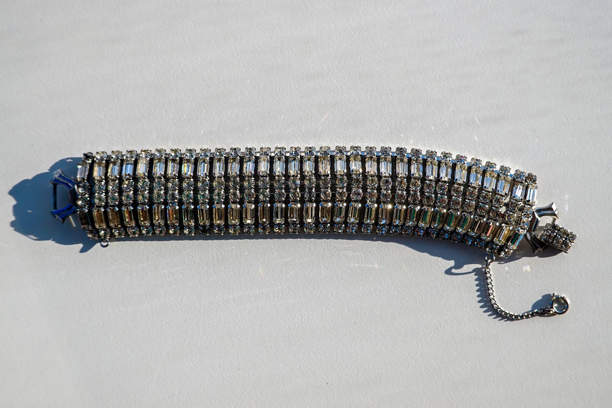 This stunning silver tone statement bracelet was made by Weiss in the mid-century. Featuring six ROWS of rhinestones: two long rectangular cut and four fancy round cut. It's so wide that I would call it a cuff. It also has a safety latch and a deco-style clasp that has rhinestones on it. I would wear it with the clasp facing up. I almost kept it for my personal collection, it is so beautiful. Timeless design here, in the deco style. Most certainly early 1950's or 1940's.