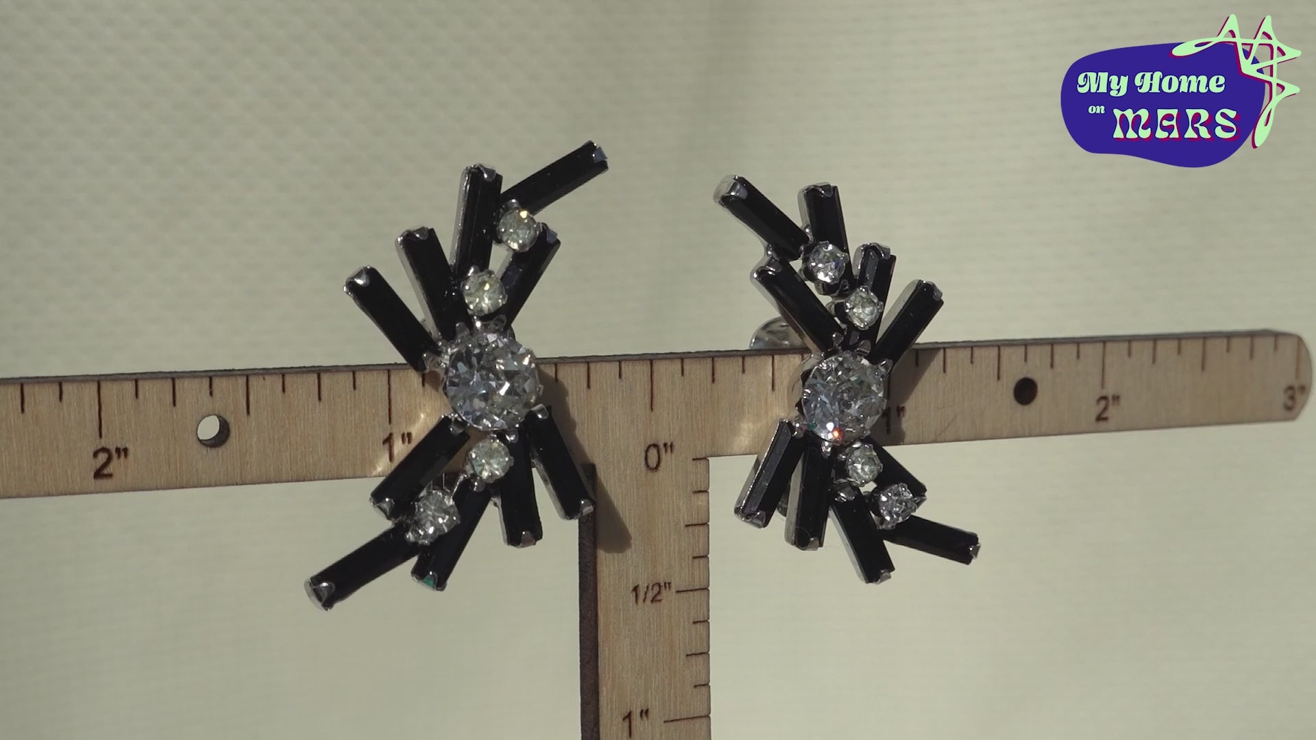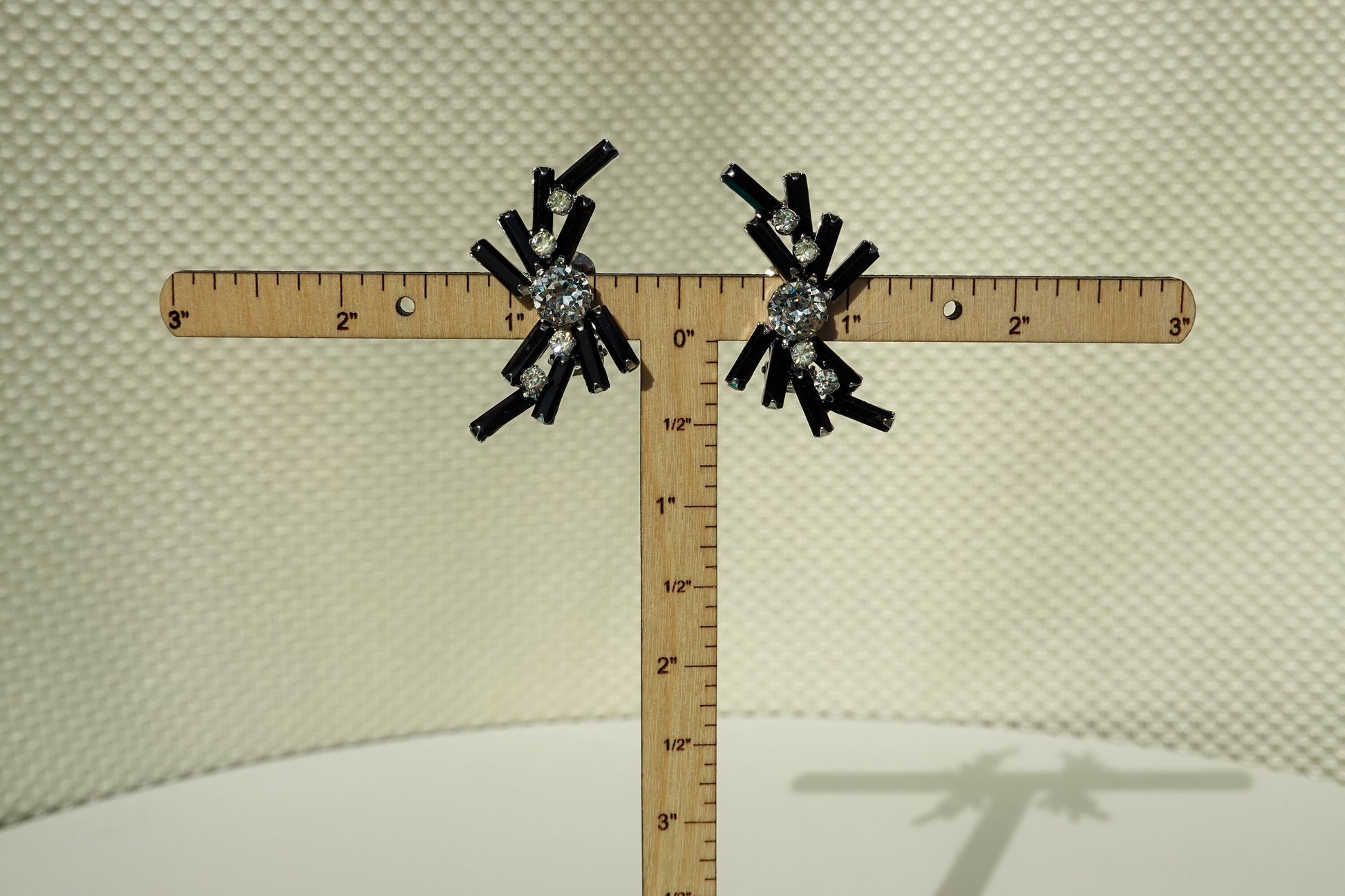 Stunners. These silver tone clip-on earrings feature 10 black baguette cut rhinestones that "climb" up the piece in a playful design. In the center is a large brilliant cut clear rhinestone, and four smaller identical stones are placed throughout. It reminds me of confetti, but classy. Extremely elegant.