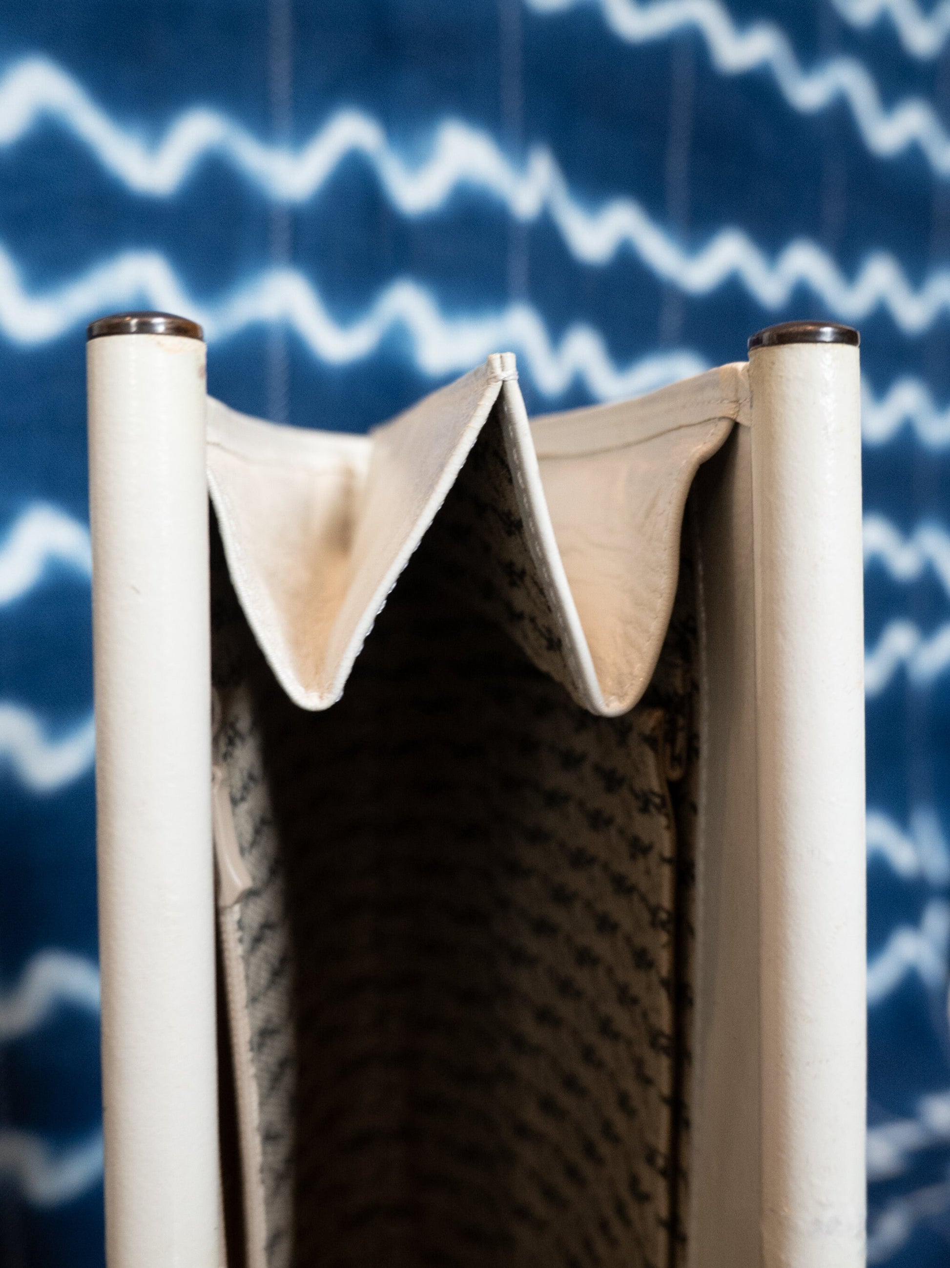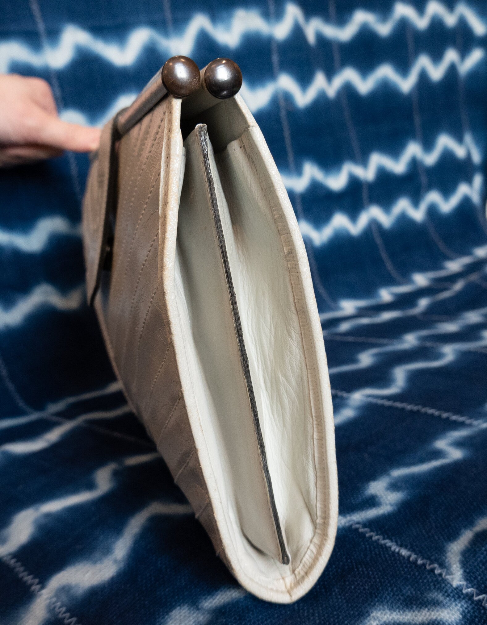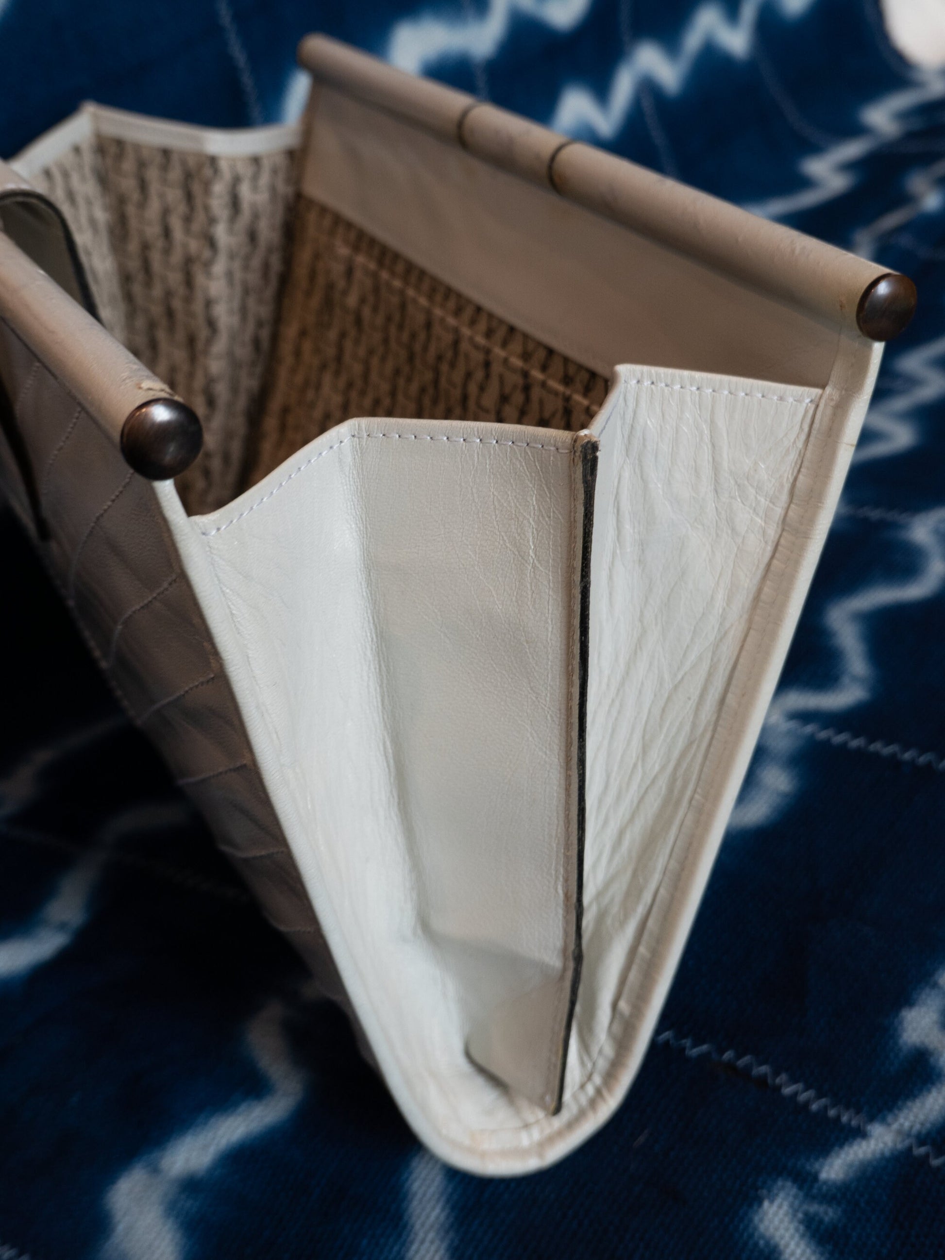 Chevron pattern made by individual strips of leather sewn together. Gorgeous.