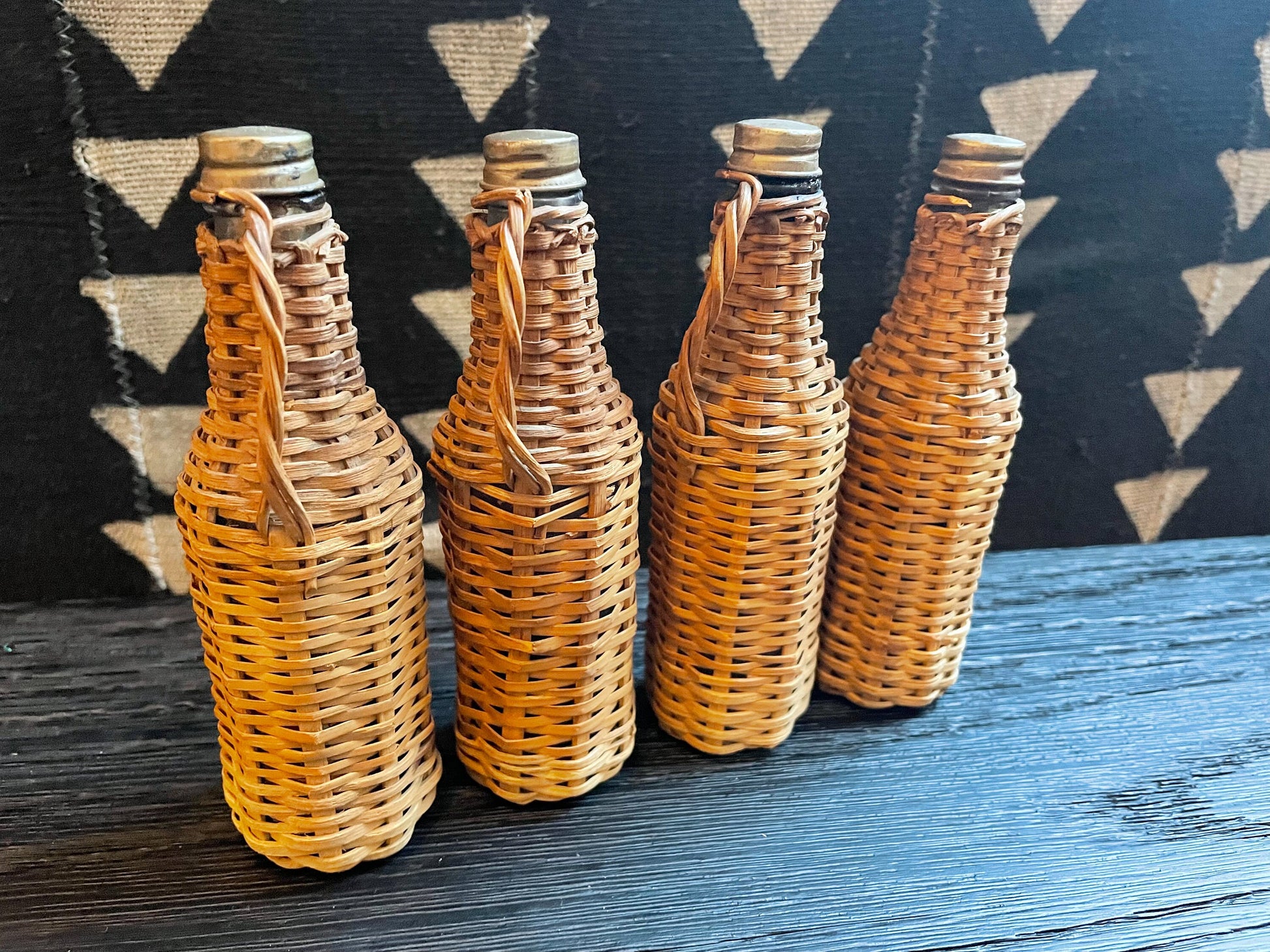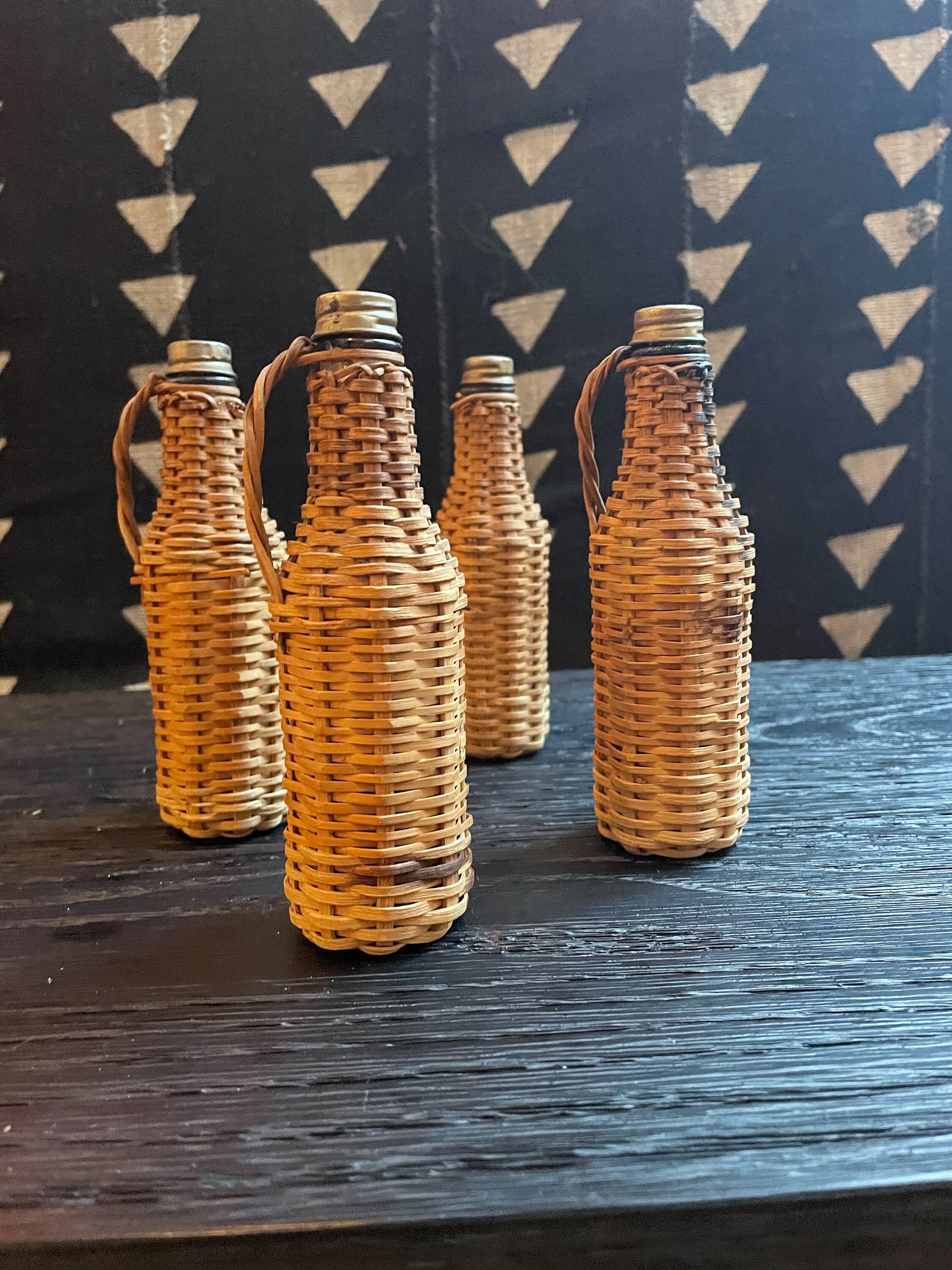 Precious mini glass bottles covered in wicker, with wicker woven handles.