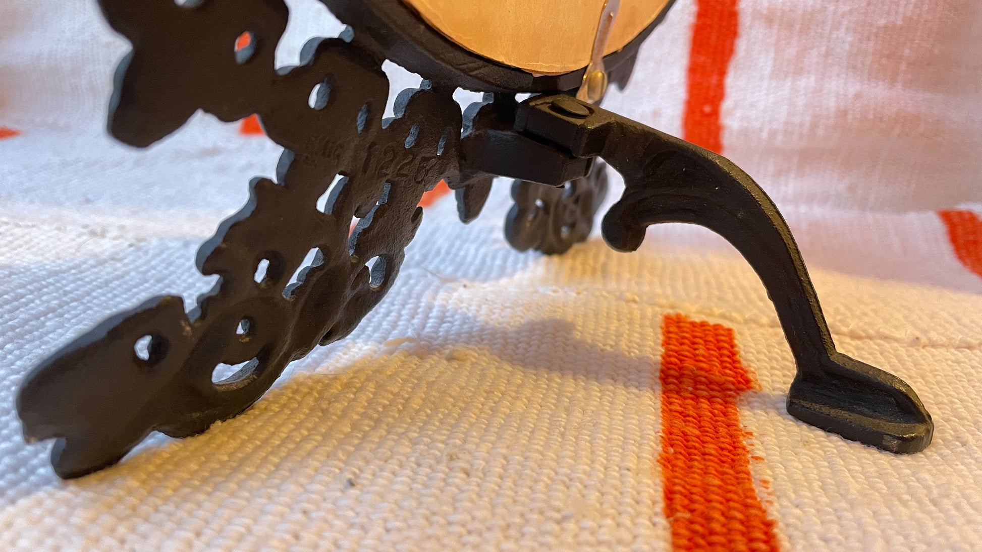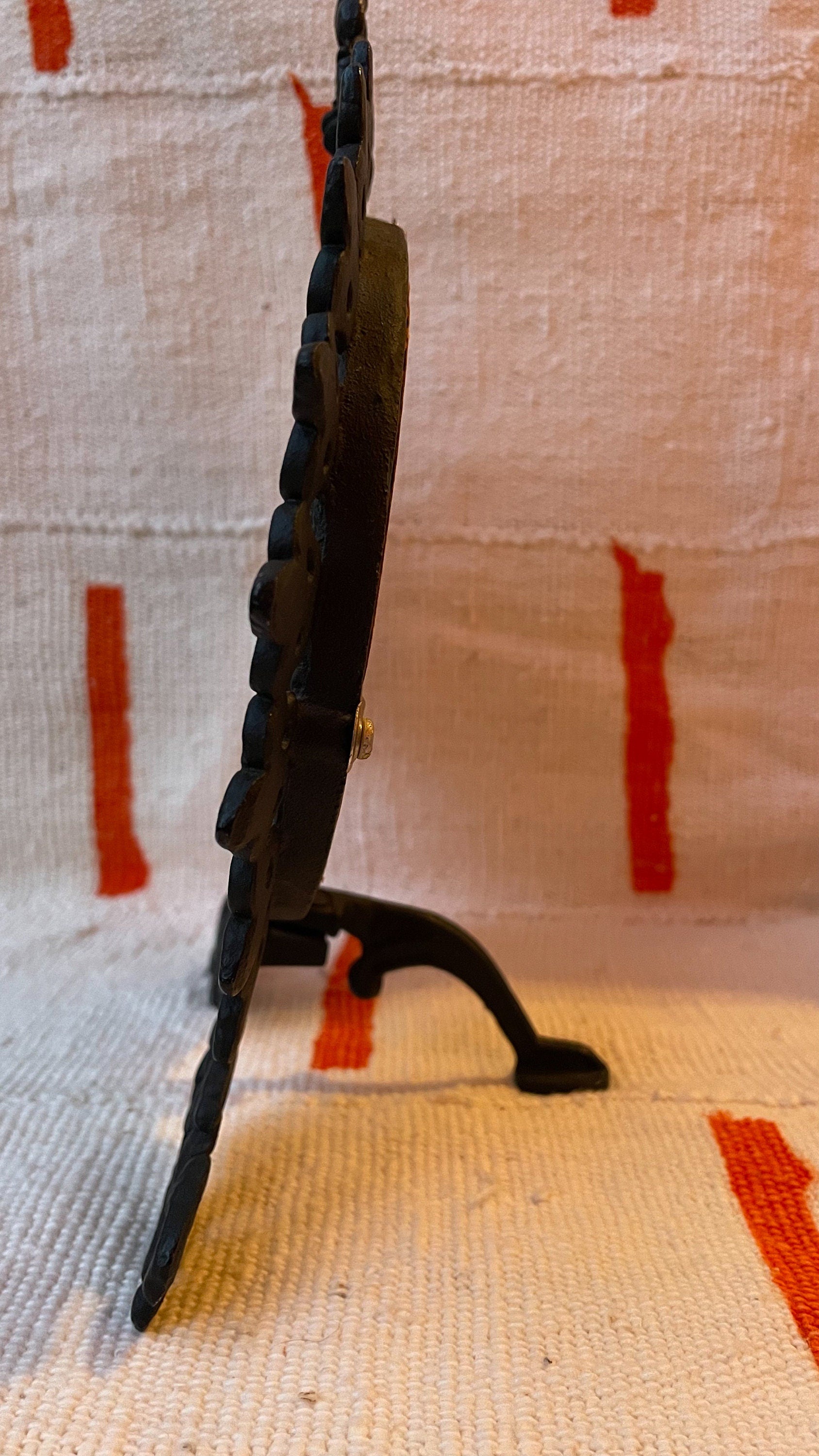 Fantastic handmade and stamped wrought iron tabletop mirror. This is either one of a kind, or part of a limited series, given the marking on the backside of the frame. Stamped "EMIG 1225" makers mark.