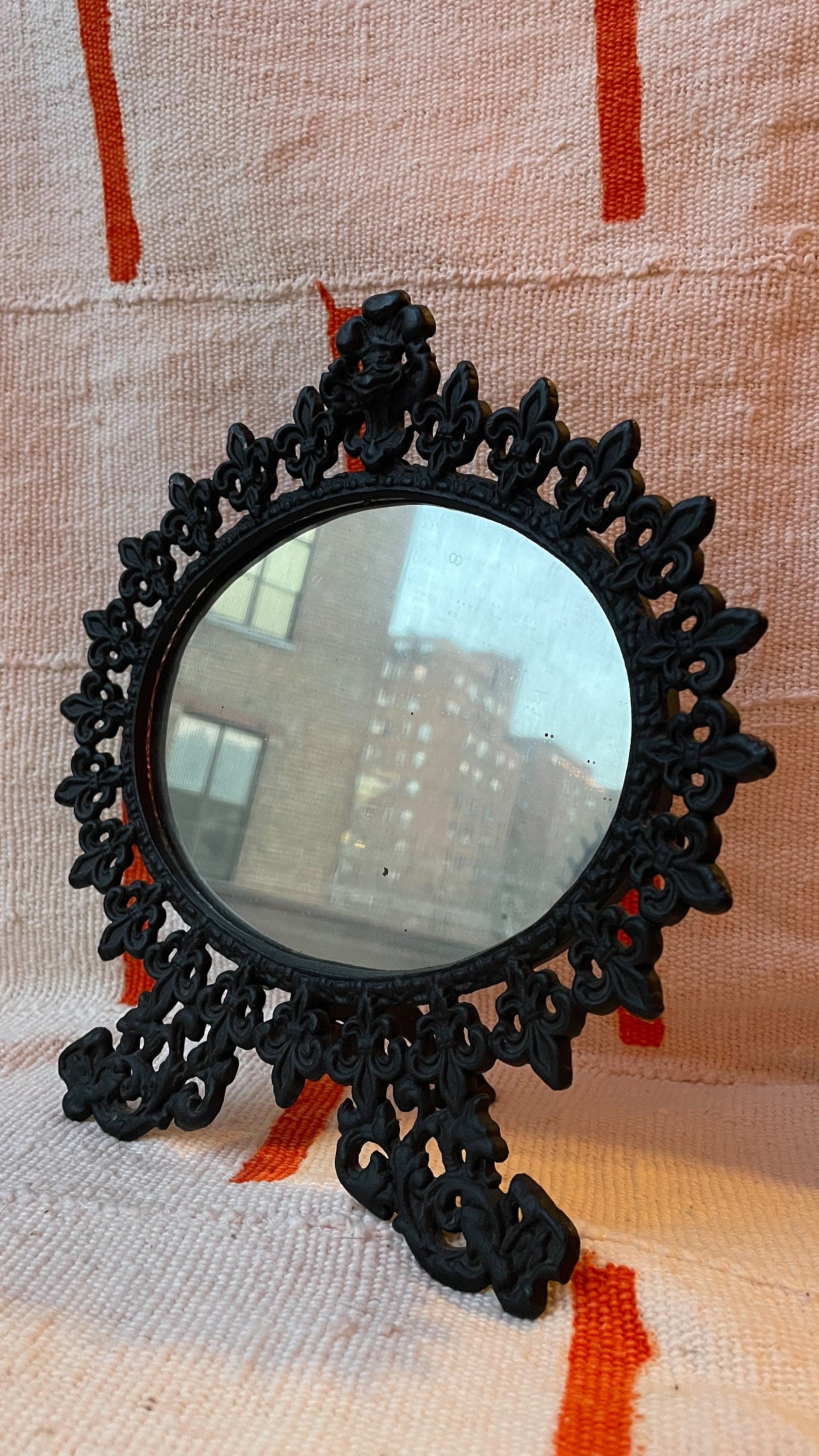Fleur de lys detailing constitute the entire frame, and give this a royal feeling. Perfect gift for the prince or princess in your life. It would also make a great addition to a dressing table, vanity, or general punk or goth setup in the home.